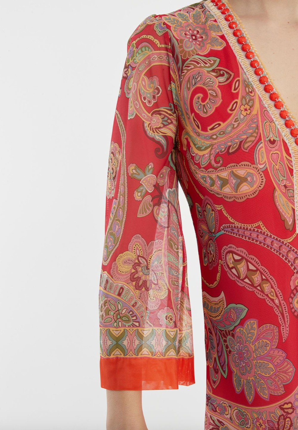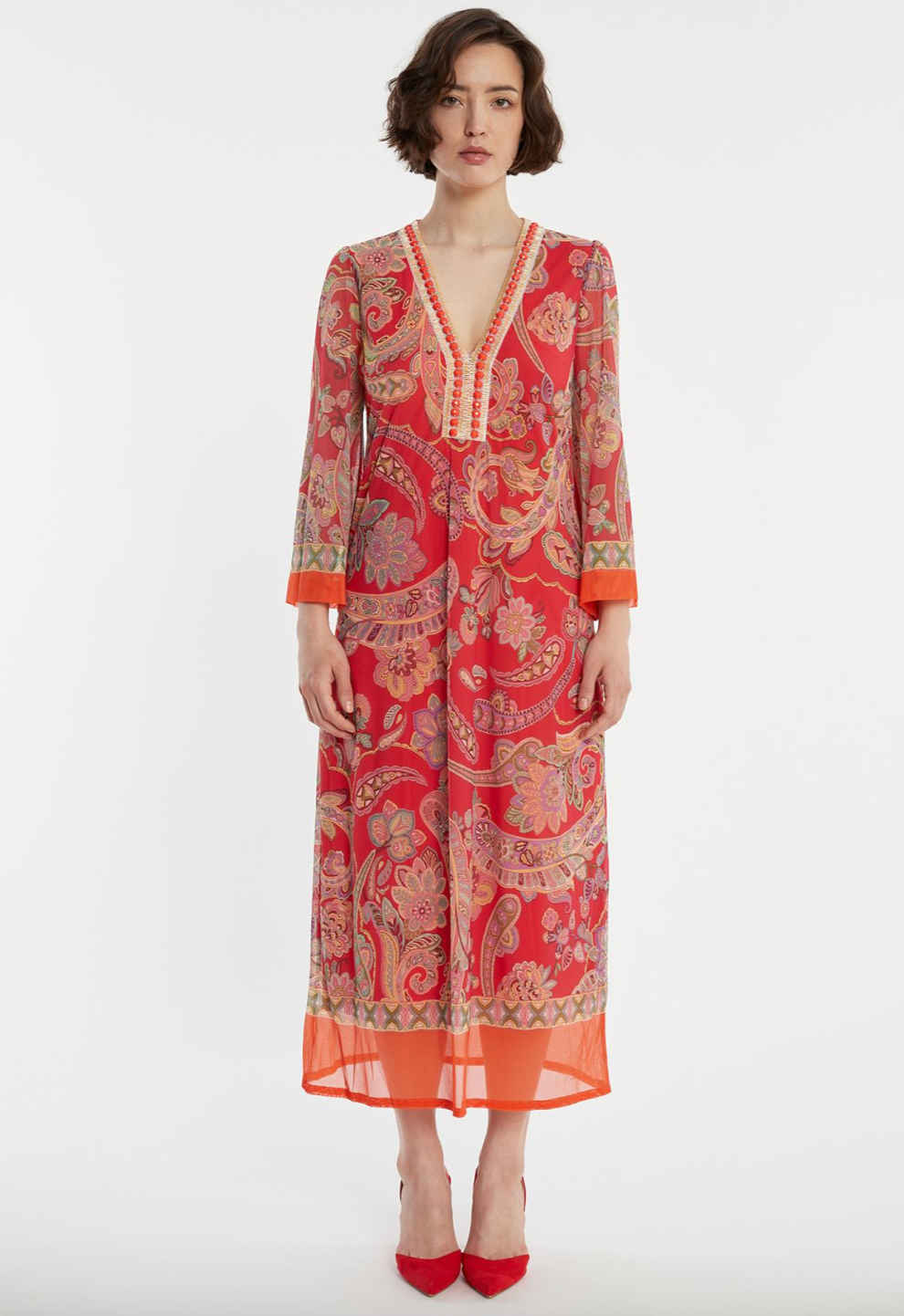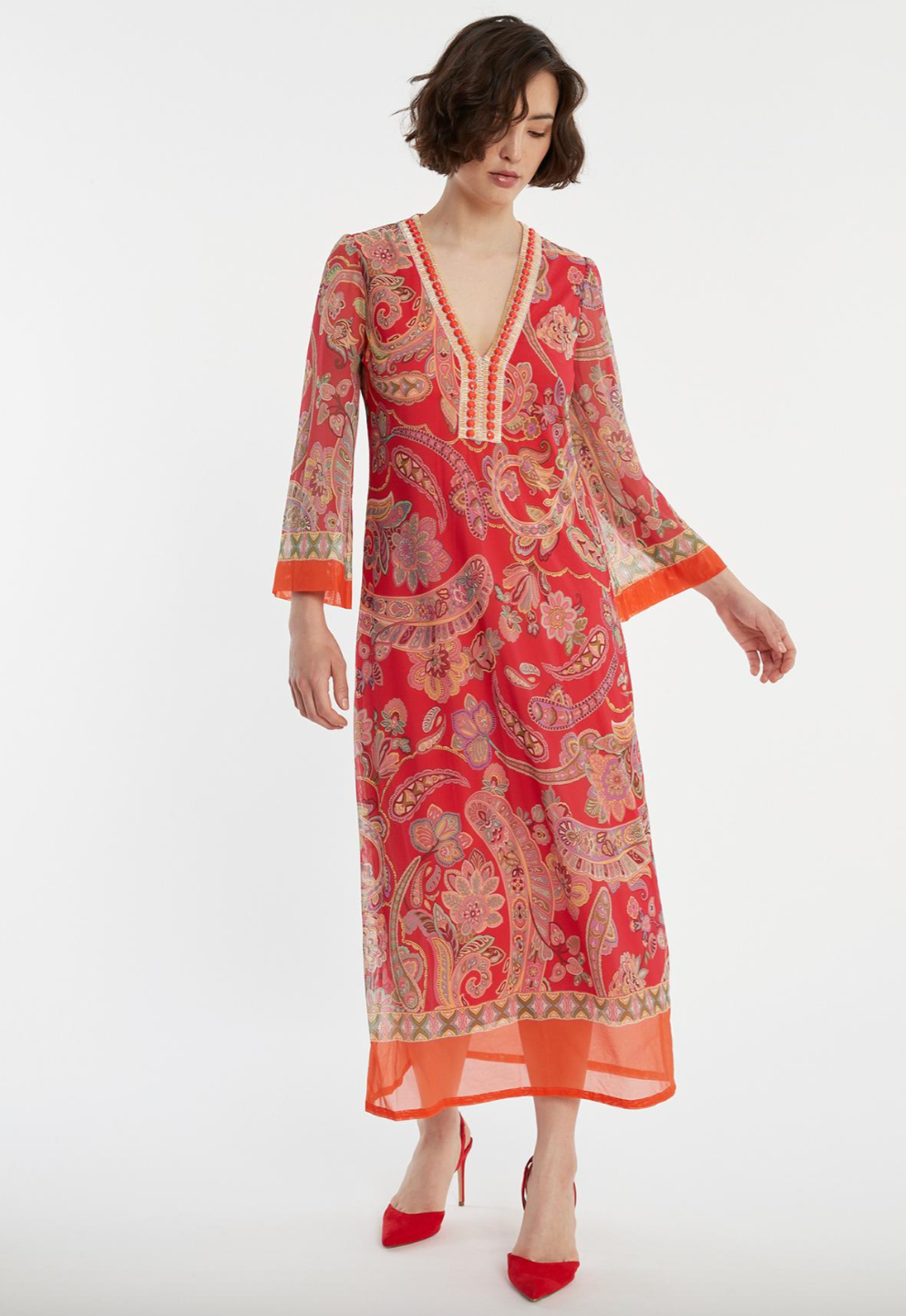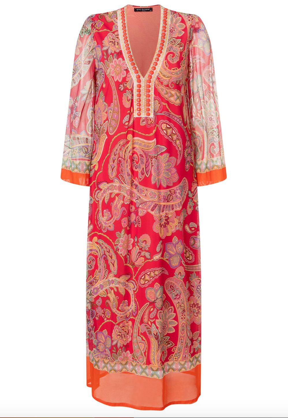 Indulge in the luxurious feel of the Zetory Kaftan Dress in Pink. Made from 100% polyester, this maxi dress features a beautiful paisley pattern and decorative ribbon detailing. Perfect for any occasion, this dress will make you feel elegant and stylish. From Tricia Jones GmbH, based in Munich, Germany.