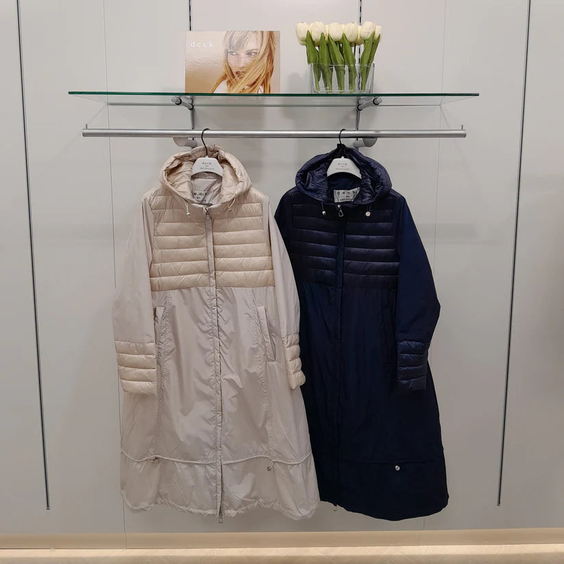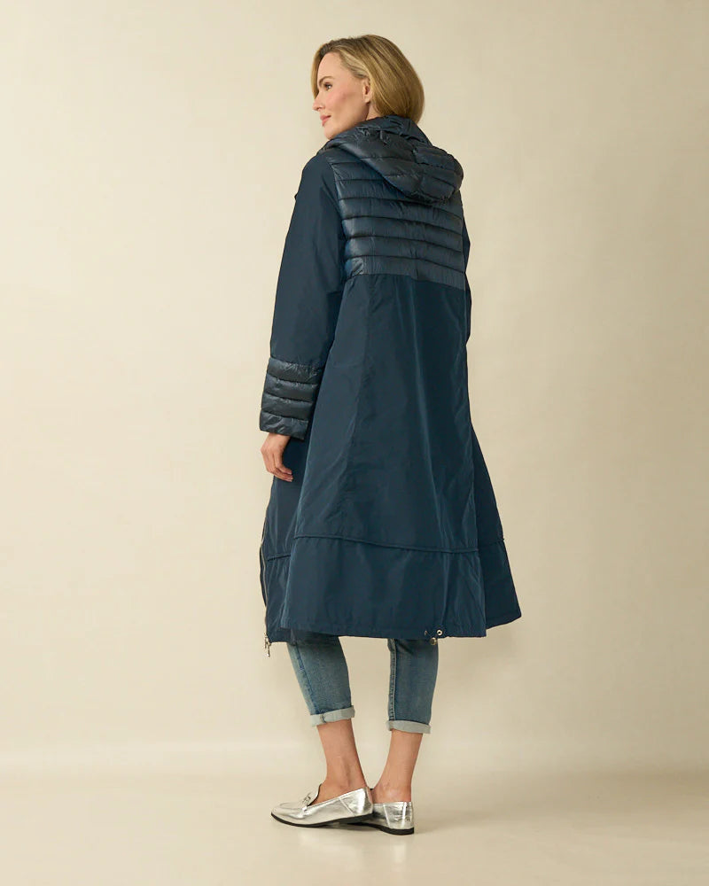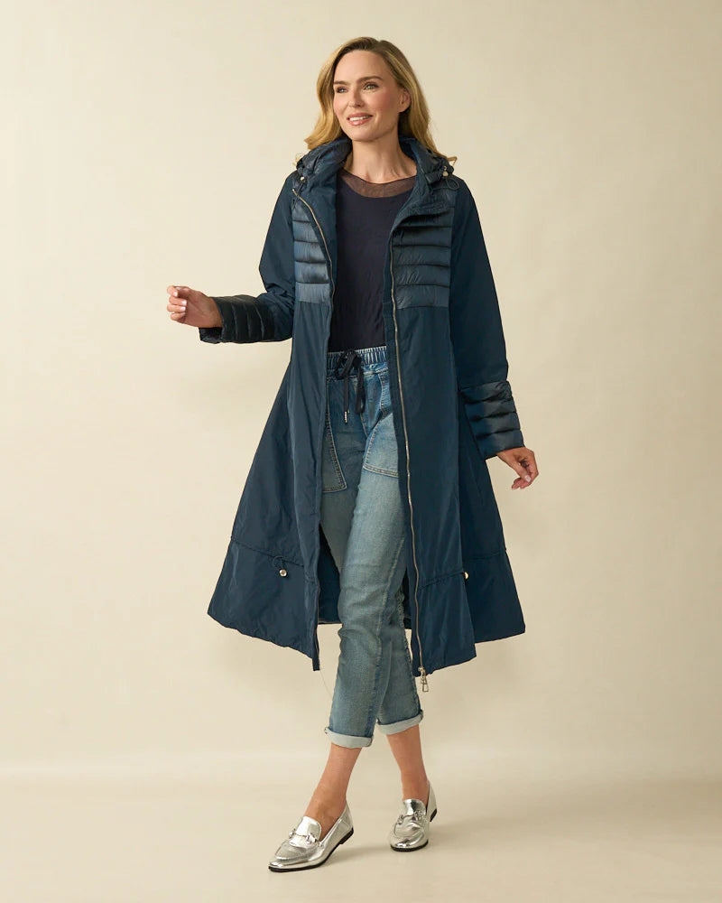 Introducing the Deck By Decollage Lightweight Coat in Navy! Stay warm and stylish with this sleek design, featuring a convenient hood and padded detailing. Perfect for any weather, this coat is a must-have for any wardrobe.