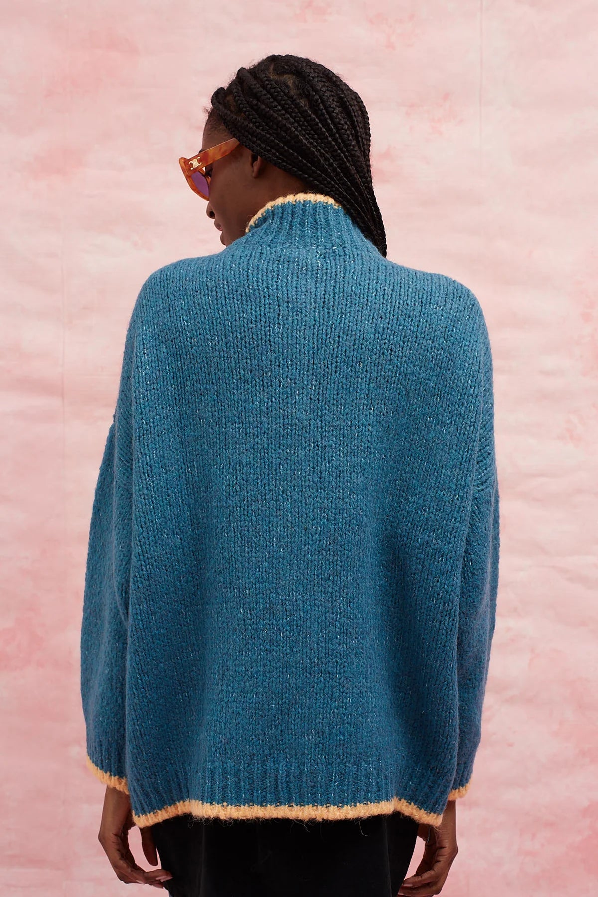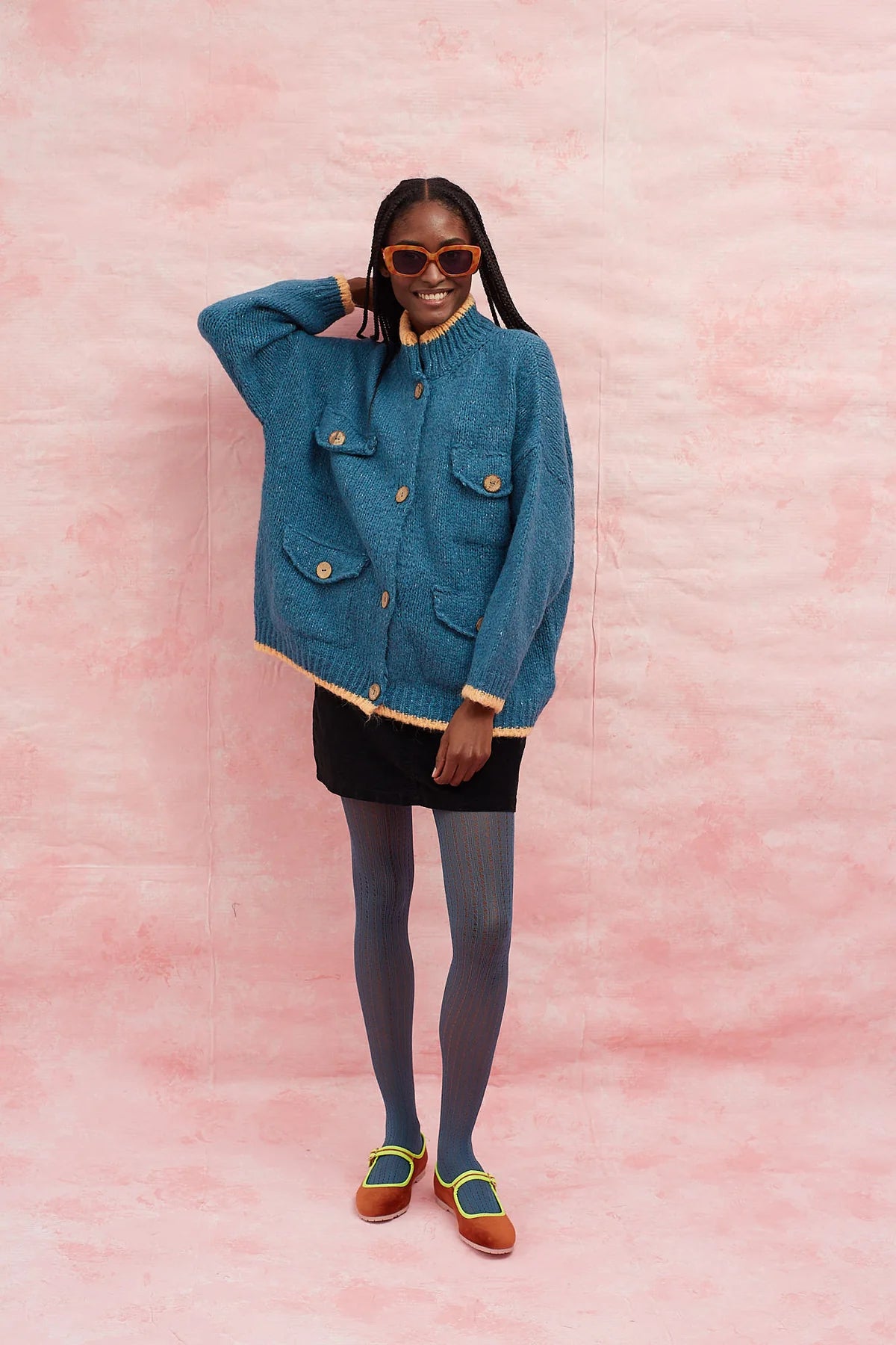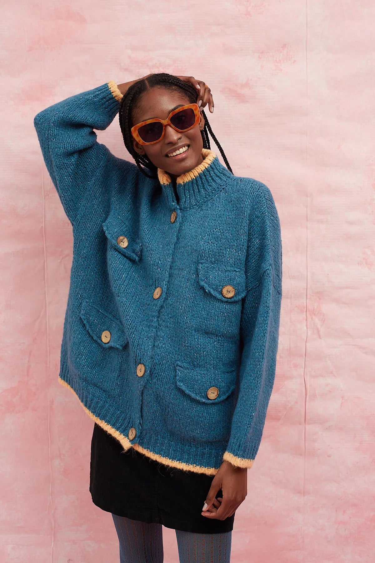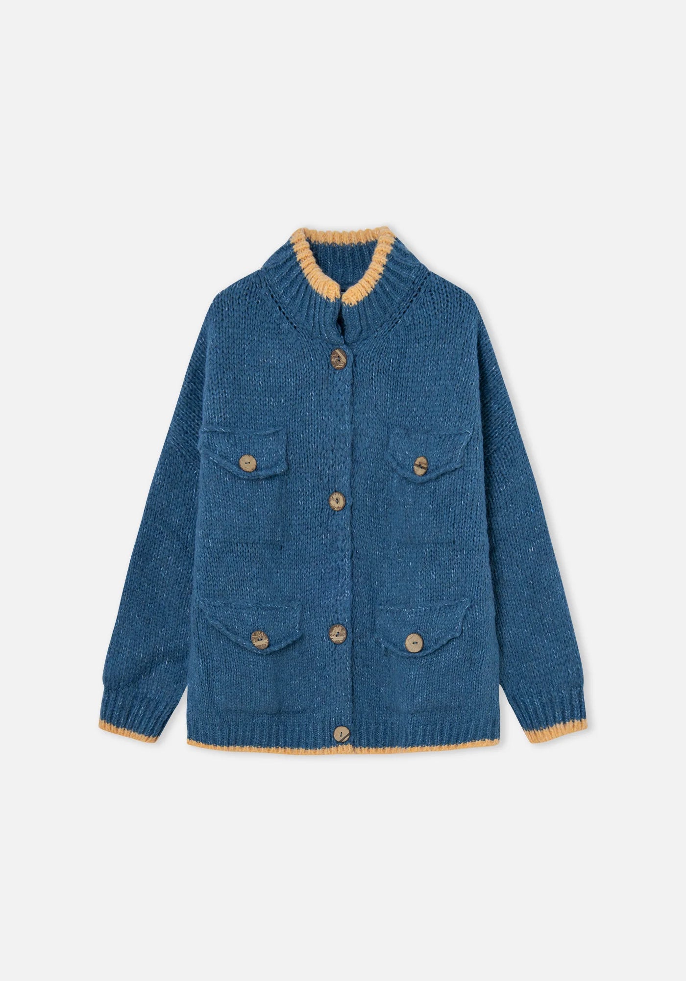 Introducing the Boom-Boom Cardigan in Blue by Dr Bloom - a must-have for any fashion-forward individual! This oversized knitted jacket features blue front pockets and a straight, wide, and long cut for ultimate comfort and style. The chimney collar and wooden buttons add unique flair, while the contrasting salmon-coloured stripes and thick yet light fabric make this cardigan a pleasure to wear.