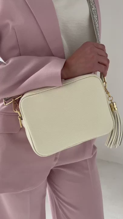 Experience luxury with the Elie Beaumont Crossbody Tassel Bag in Ivory! Crafted with premium, genuine leather, this day-to-night bag is the perfect addition to any outfit. Its versatility is amplified with a matching leather shoulder strap and removable tassel, making it a must-have for any fashionista. Explore our selection of customisable straps too! Made in Italy, this bag exudes elegance and style.
