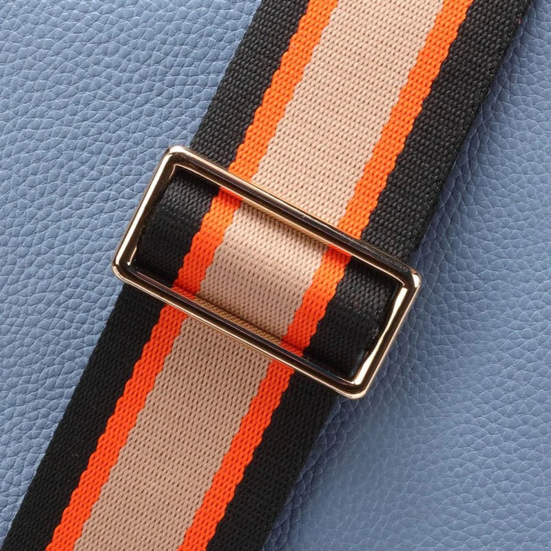 Transform your bag and stand out from the crowd with the Elie Beaumont Wide Bag Strap in Orange Black. Customize your look with our range of trendy straps, all fully adjustable for versatile wear on the shoulder or as a crossbody. Complete with sleek light gold fittings and our signature EB logo studs. A must-have addition for any fashion-forward individual.