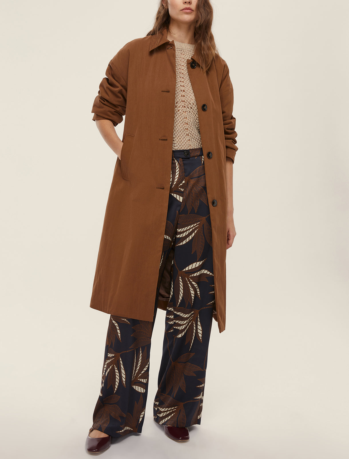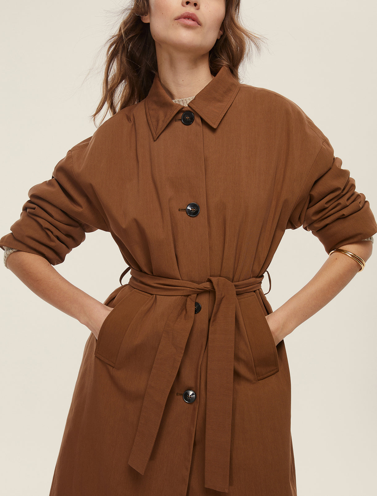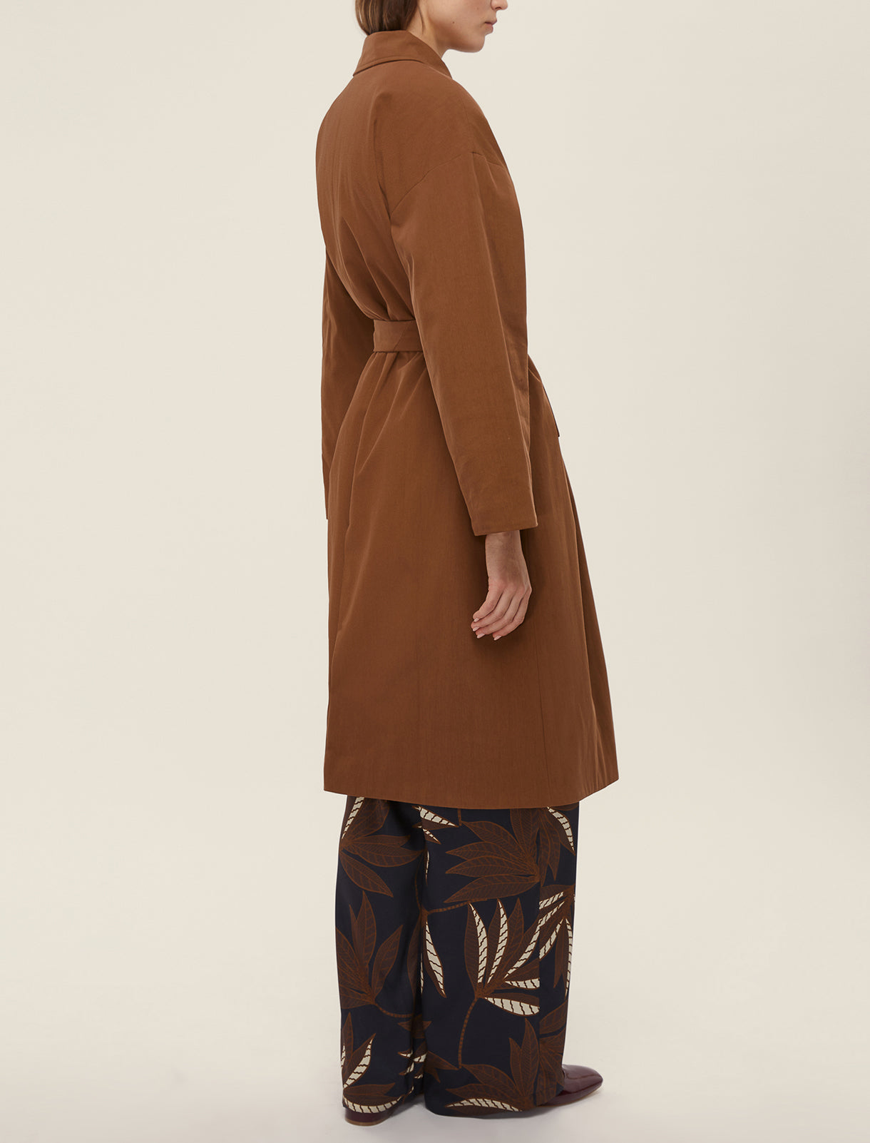 Elevate your outerwear with the Emme Marella Agostin Raincoat in Dark Brown. Featuring a classic collared design and buttons down the front, this coat offers timeless style and easy wear. The adjustable tie waist enhances your silhouette, providing a flattering fit while keeping you comfortable. Perfect for unpredictable weather, this raincoat combines practicality with elegant sophistication, making it an essential addition to your wardrobe.