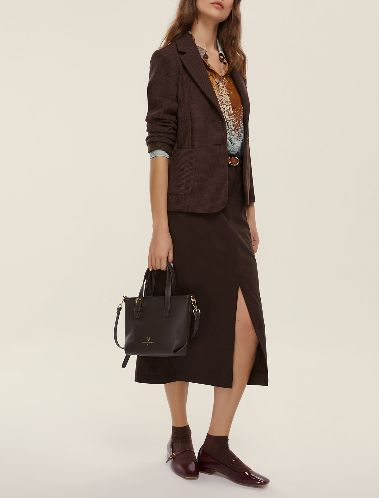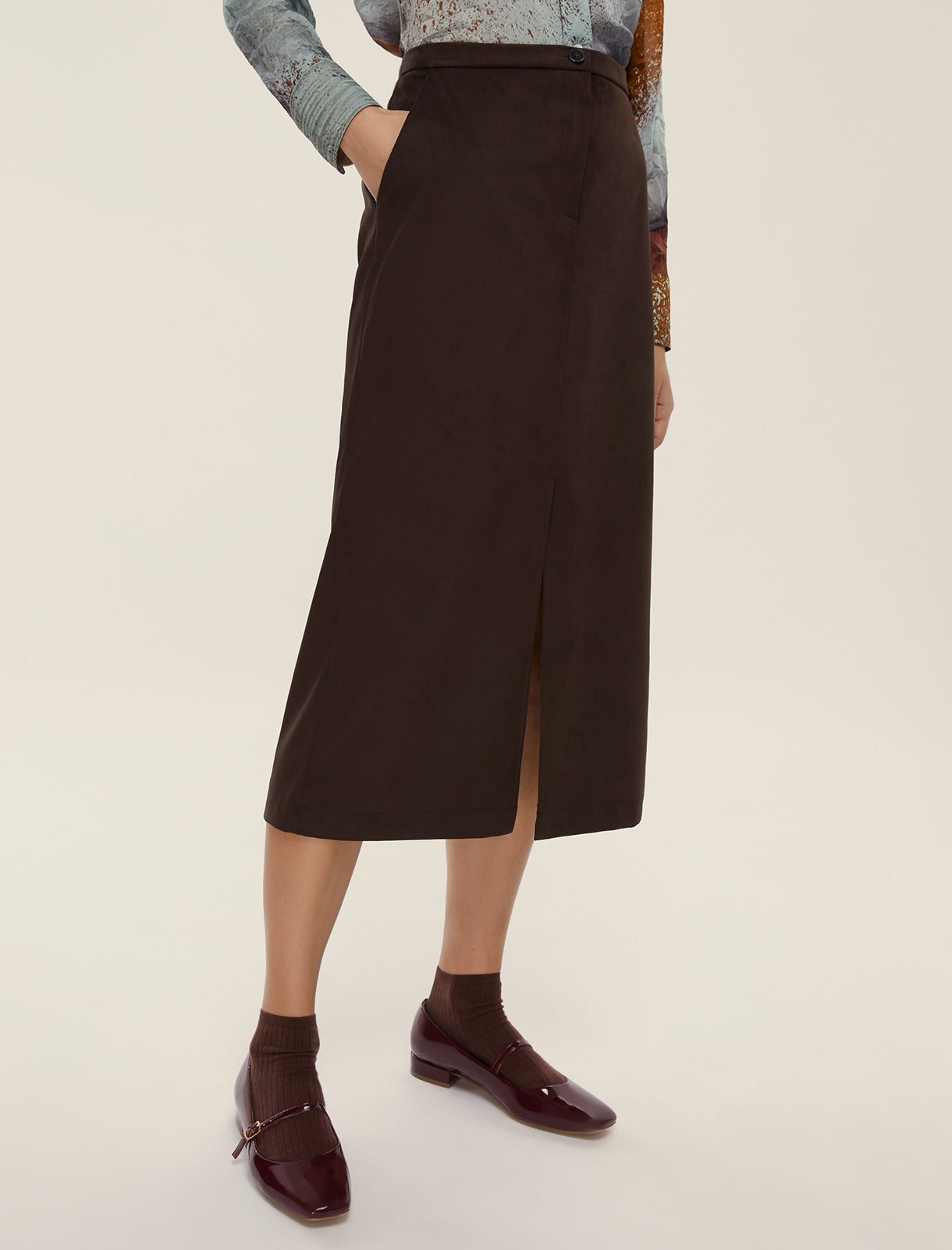 The Emme Marella Dritto Skirt in Dark Brown features a stylish thigh split that adds a modern edge while maintaining professionalism. Perfect for the workplace, its sleek design ensures you stay comfortable and confident throughout your day. Elevate your work wardrobe with this versatile skirt that blends elegance and practicality effortlessly.