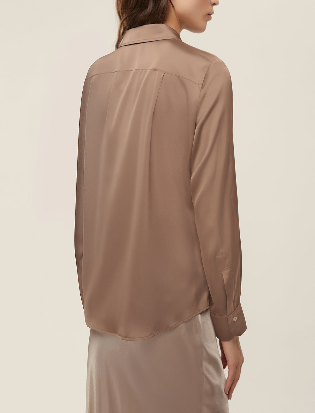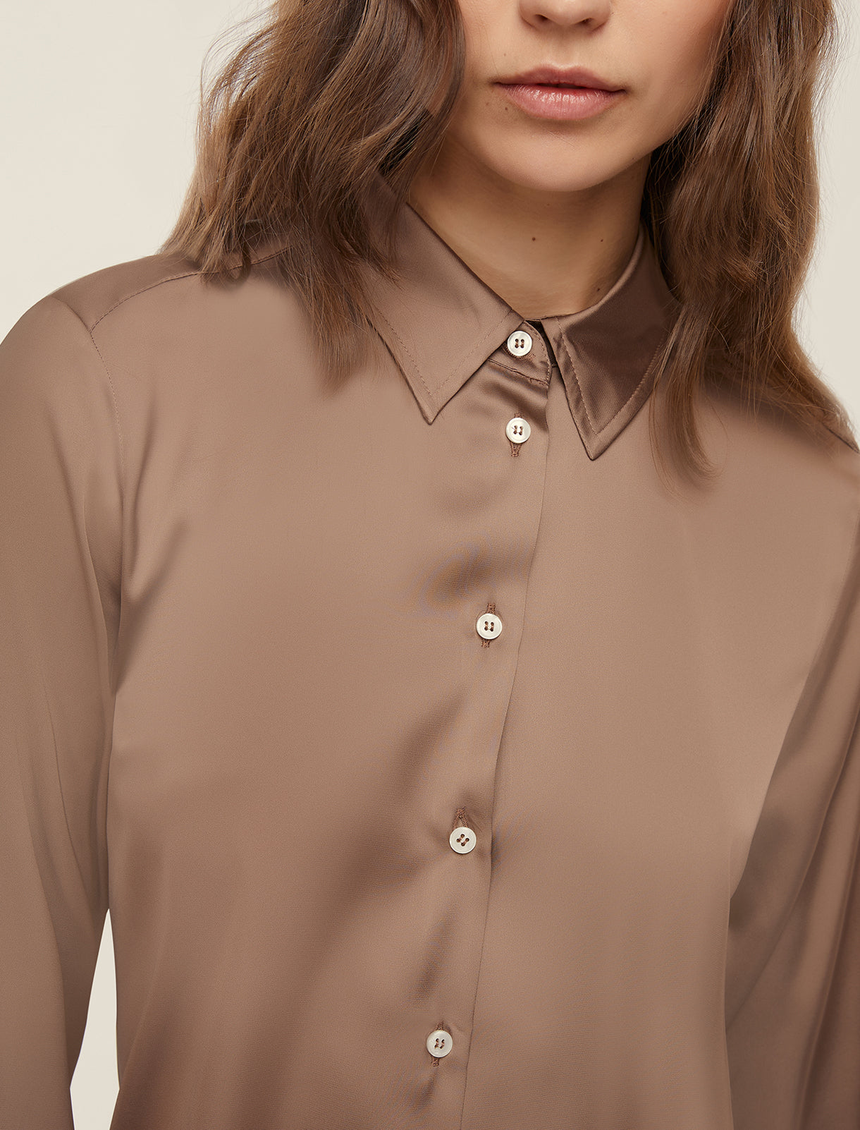 The Emme Marella Emm-Naples Latte blouse in Latte satin effortlessly elevates any outfit. Its fluid fabric drapes gracefully, catching the light to add subtle shine. The relaxed shirt silhouette offers comfort and ease, while the silky finish brings a polished touch. Perfect for dressing up jeans or complementing tailored pieces, this blouse delivers refined style without effort.