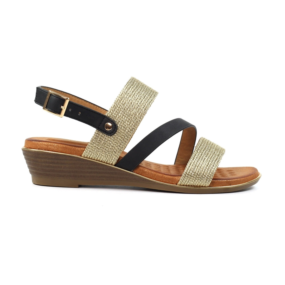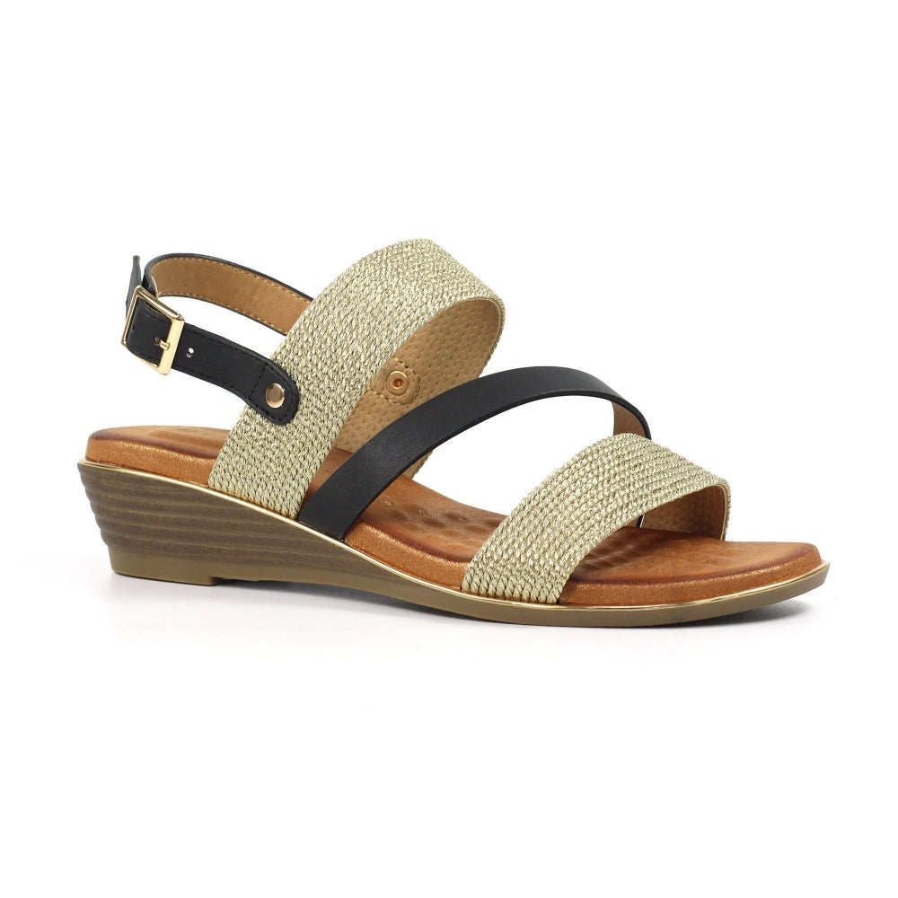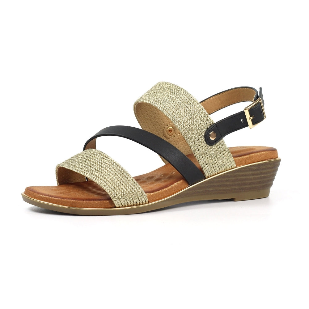 Elevate your summer style with the Pippa Wedge Sandal in Black. The sleek black design is accentuated by a shimmering gold buckle, making these slip-ons a must-have for any fashion-forward individual. Easy to wear and effortlessly chic, these sandals are the perfect addition to any warm-weather wardrobe.