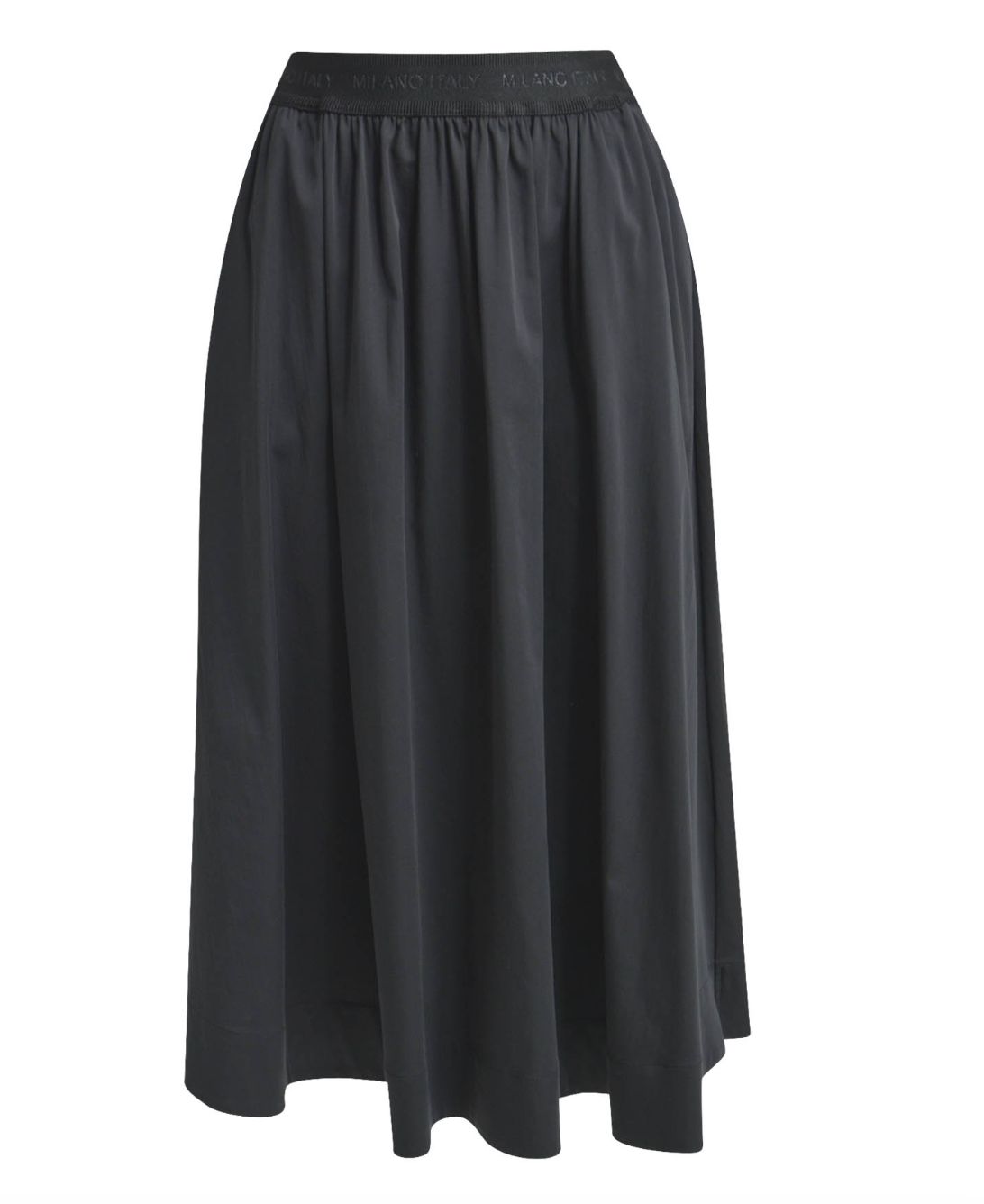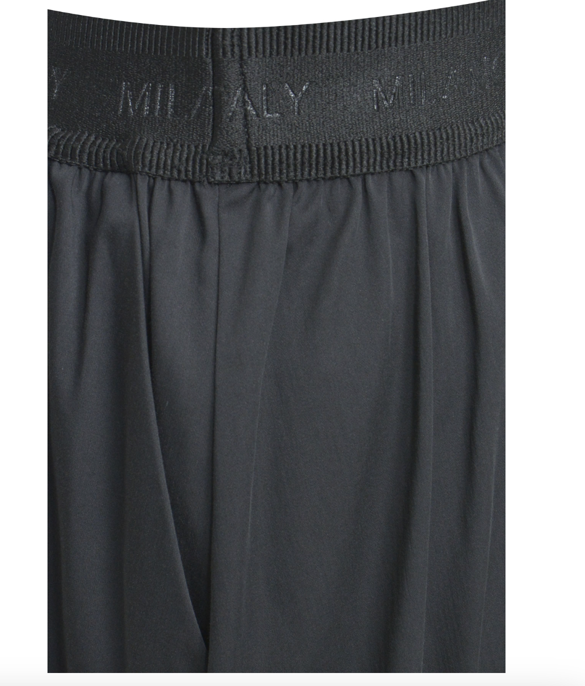 Discover effortless style with the Milano Italy wide skirt in black. Featuring an elasticated waistband branded with the Milano Italy logo, it ensures a comfortable, secure fit. Its midlength cut offers versatile elegance, perfect for both casual days and refined evenings.
