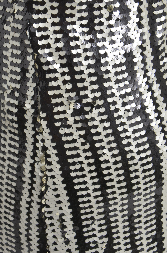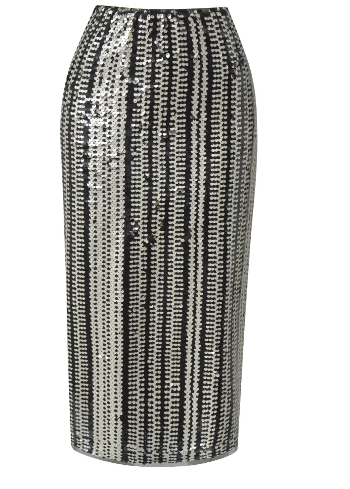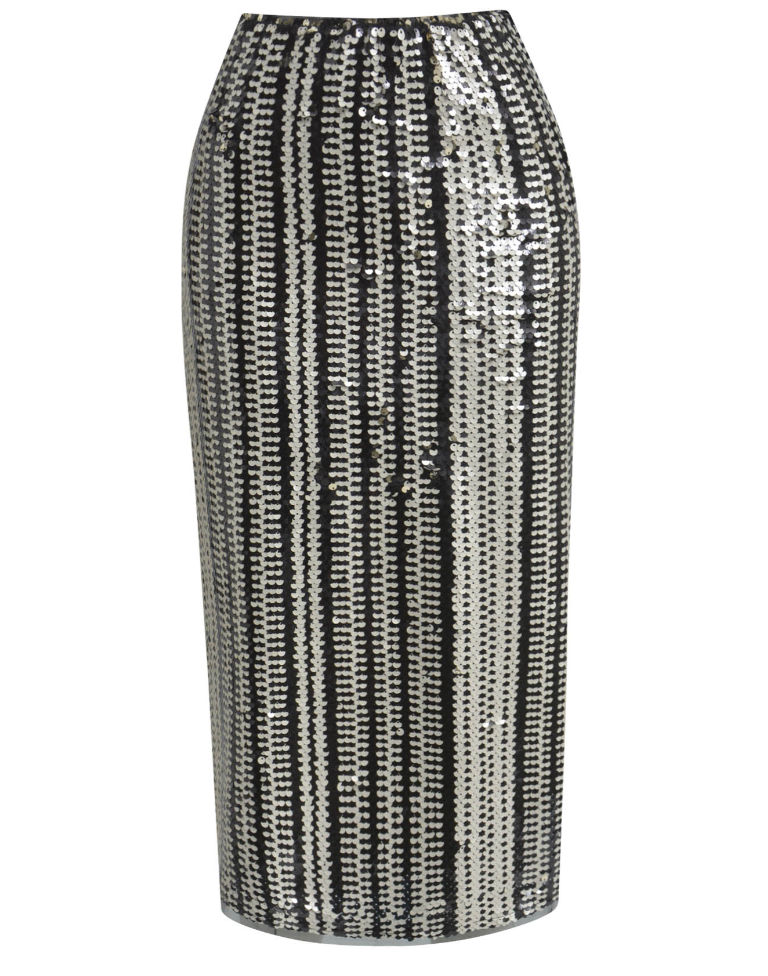 Make a bold statement with the Milano Italy Sequin Skirt in black print, featuring striking black stripes for a modern edge. This eye-catching skirt combines shimmering sequins with a sleek design, perfect for turning heads at any evening event or special occasion.