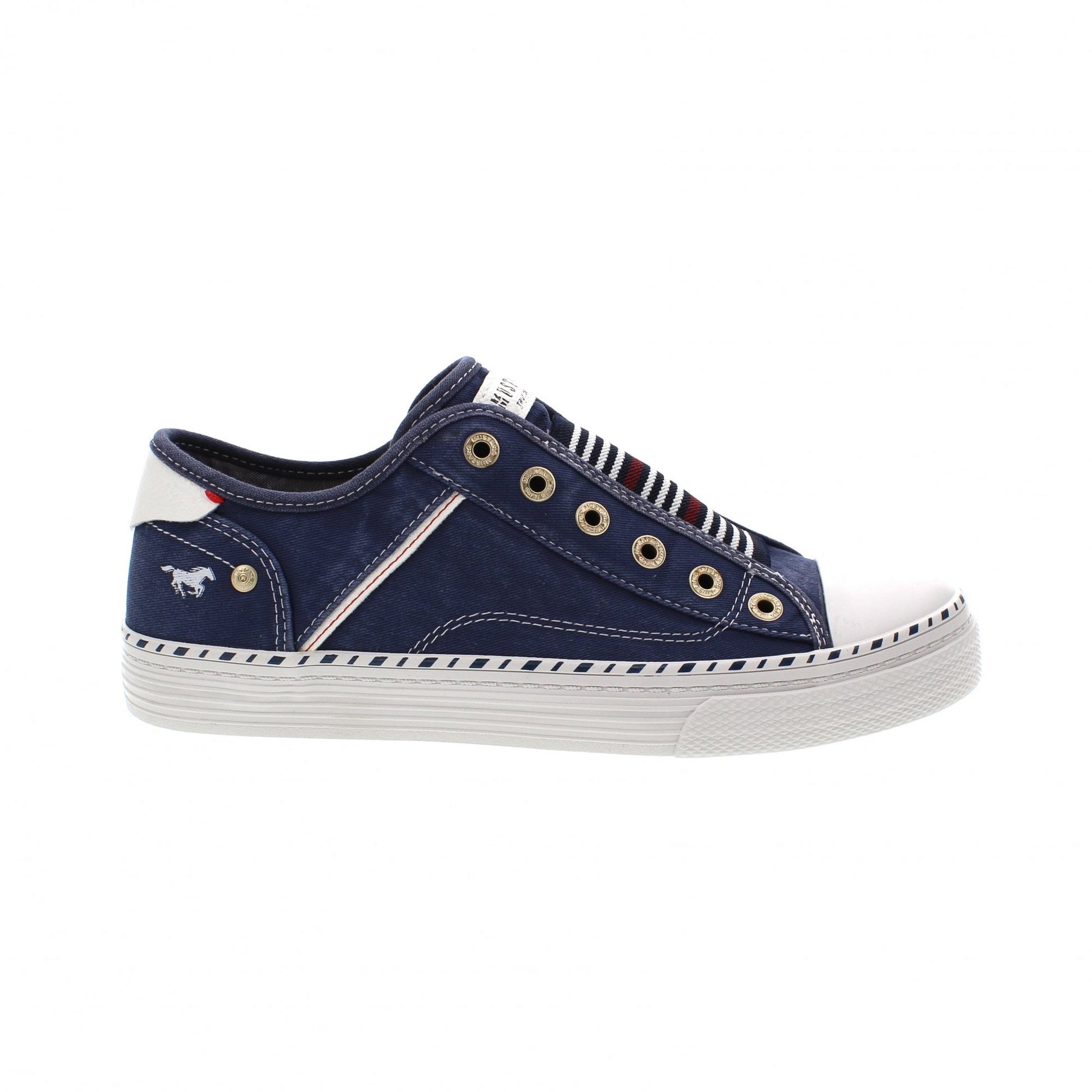 Introducing our Mustang Canvas Trainer in Denim blue! With a classic yet modern design and a chunky rubber sole, these trainers are perfect for any occasion. The canvas upper comes in two options, dark beige/clay and denim blue, both with leather-like accents. Easy to slip on with a thick elastic band, and a comfortable padded cork footbed. Show off the Mustang horse logo and name on the base.