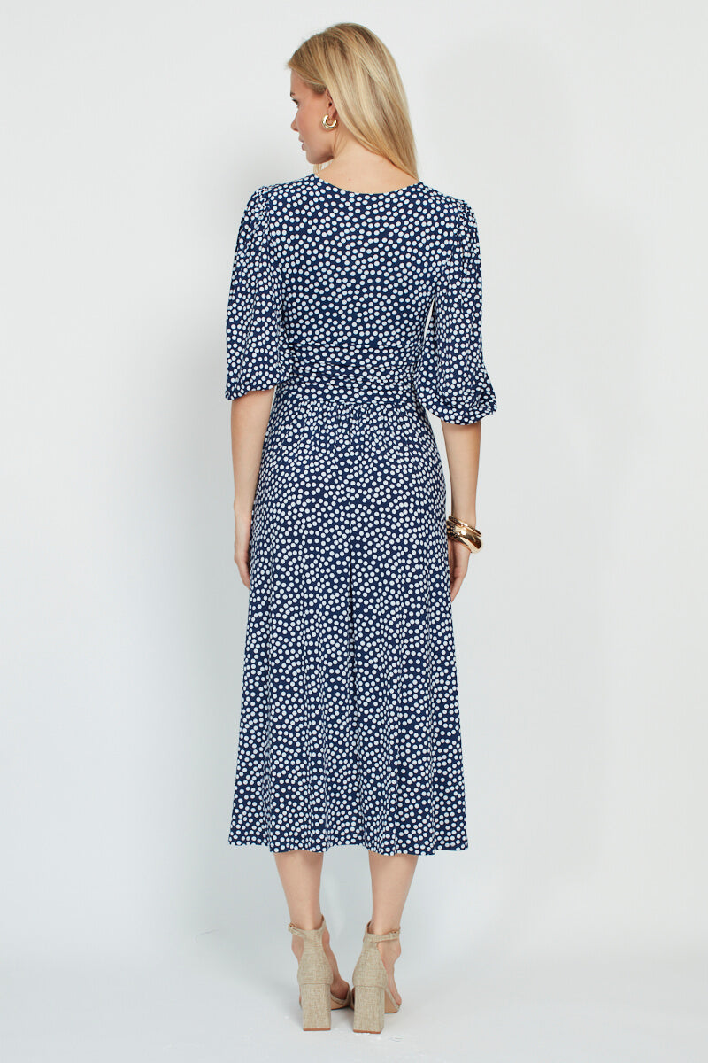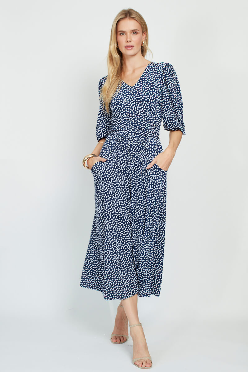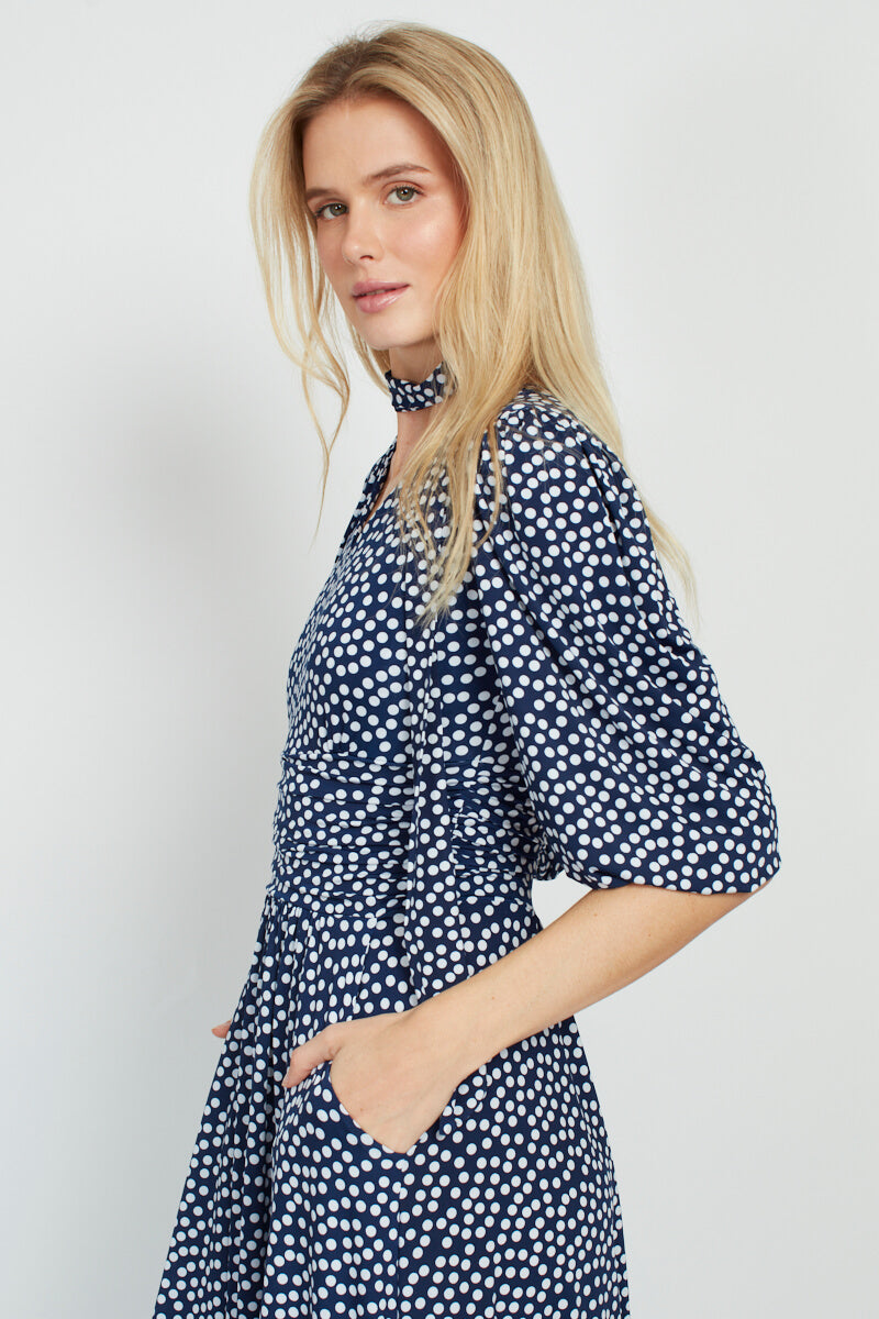 Elevate your look with the Onjenu Esme midi dress in navy dot. Embrace the romantic vibes with dramatic puff sleeves and a wide pleated waistband that flatters your silhouette. The elasticated waistline and doubled lining provide comfort, while the pockets add convenience. No need for zips - simply put on over your head and feel amazing!