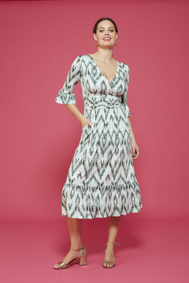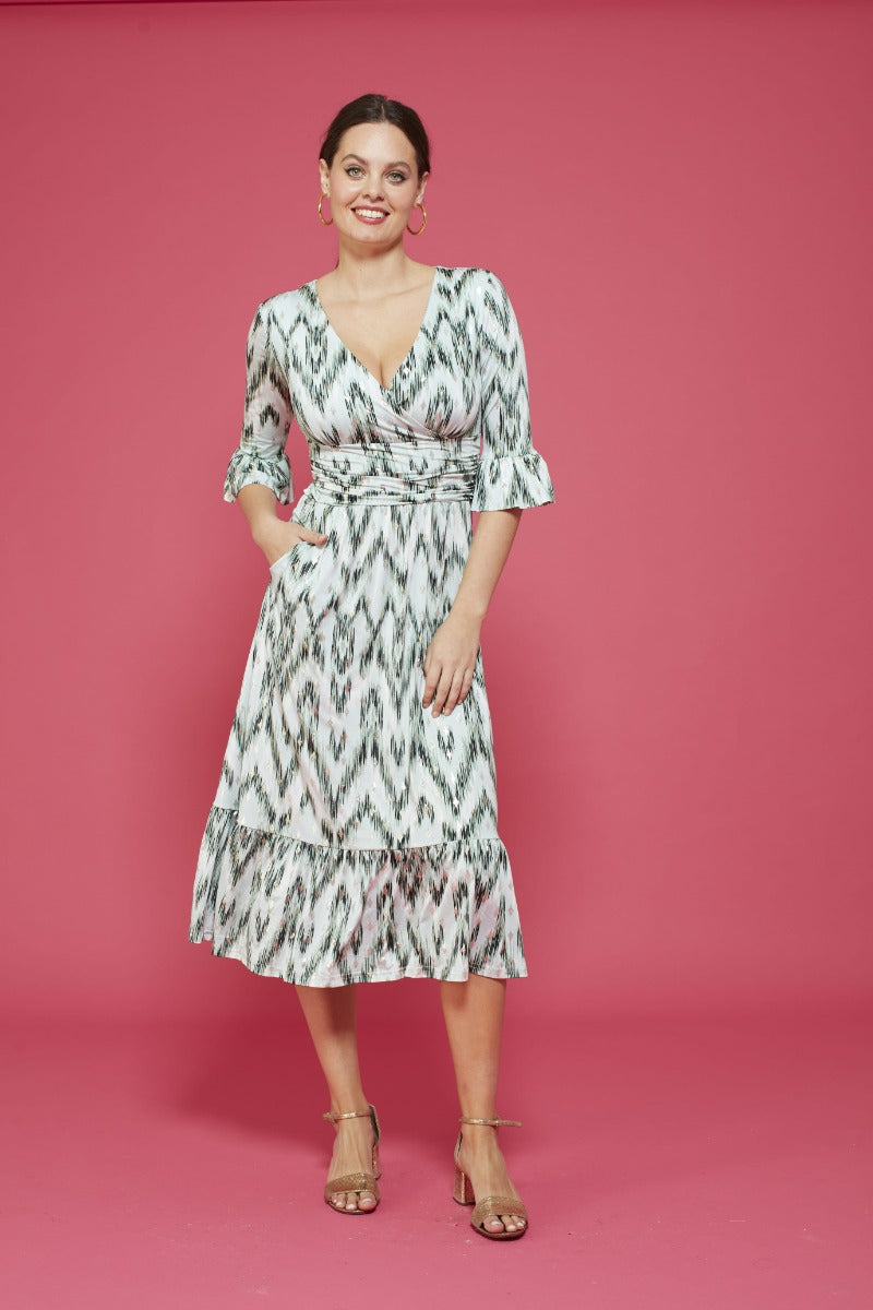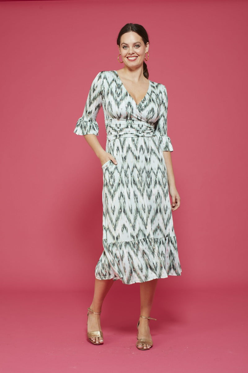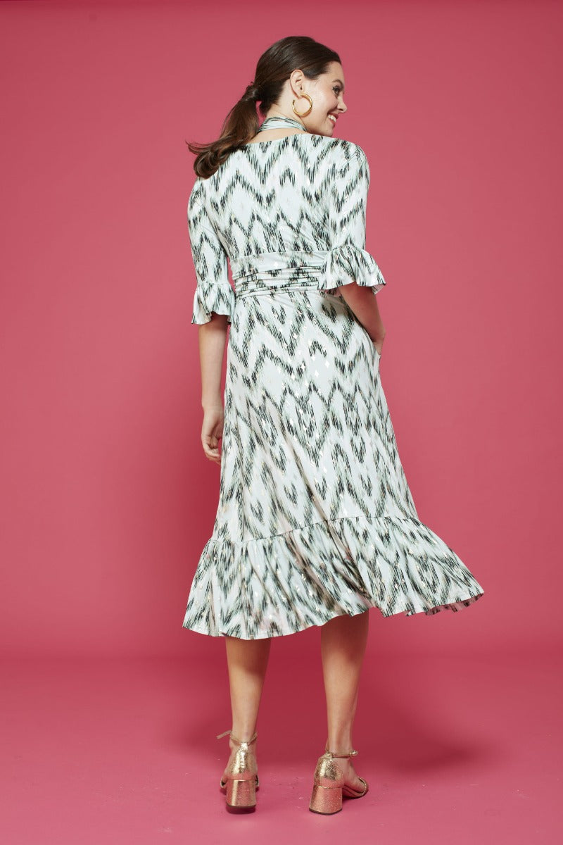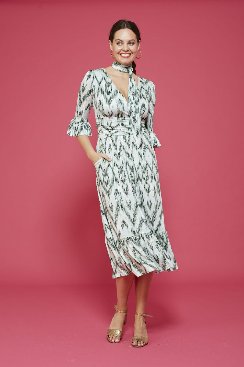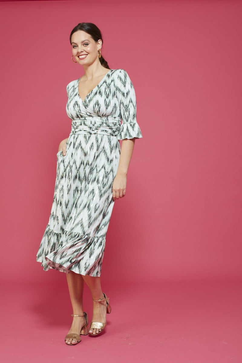 Introducing the Leslie midi dress in metallic green! With a flattering neckline, double ruched waistband, and a-line skirt, you'll look and feel amazing. The tier detail on the sleeve and skirt adds a touch of elegance, while the gold foil in the print adds a subtle shine. Plus, it's double lined for comfort and has pockets for added convenience. Elevate your wardrobe with this must-have dress!