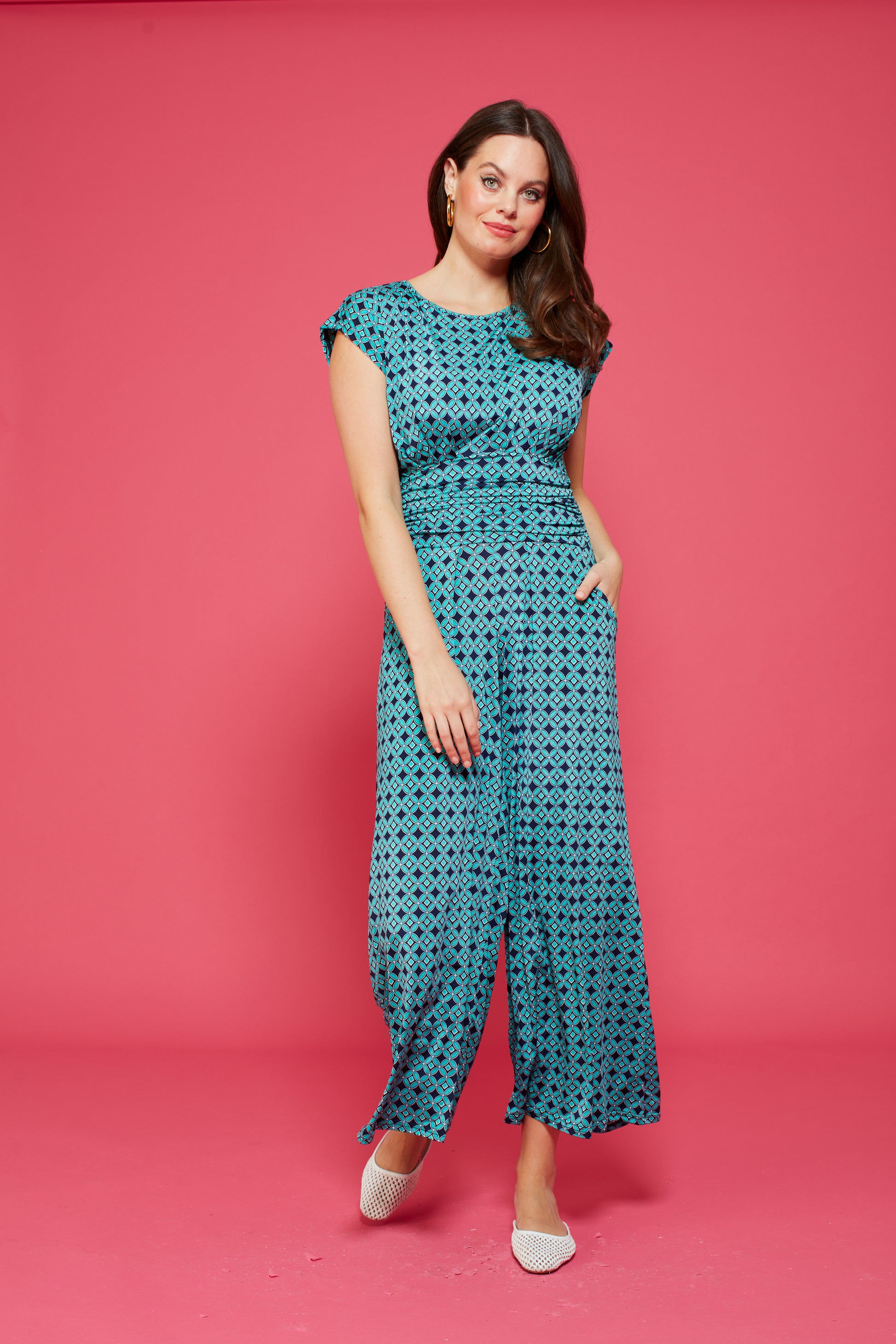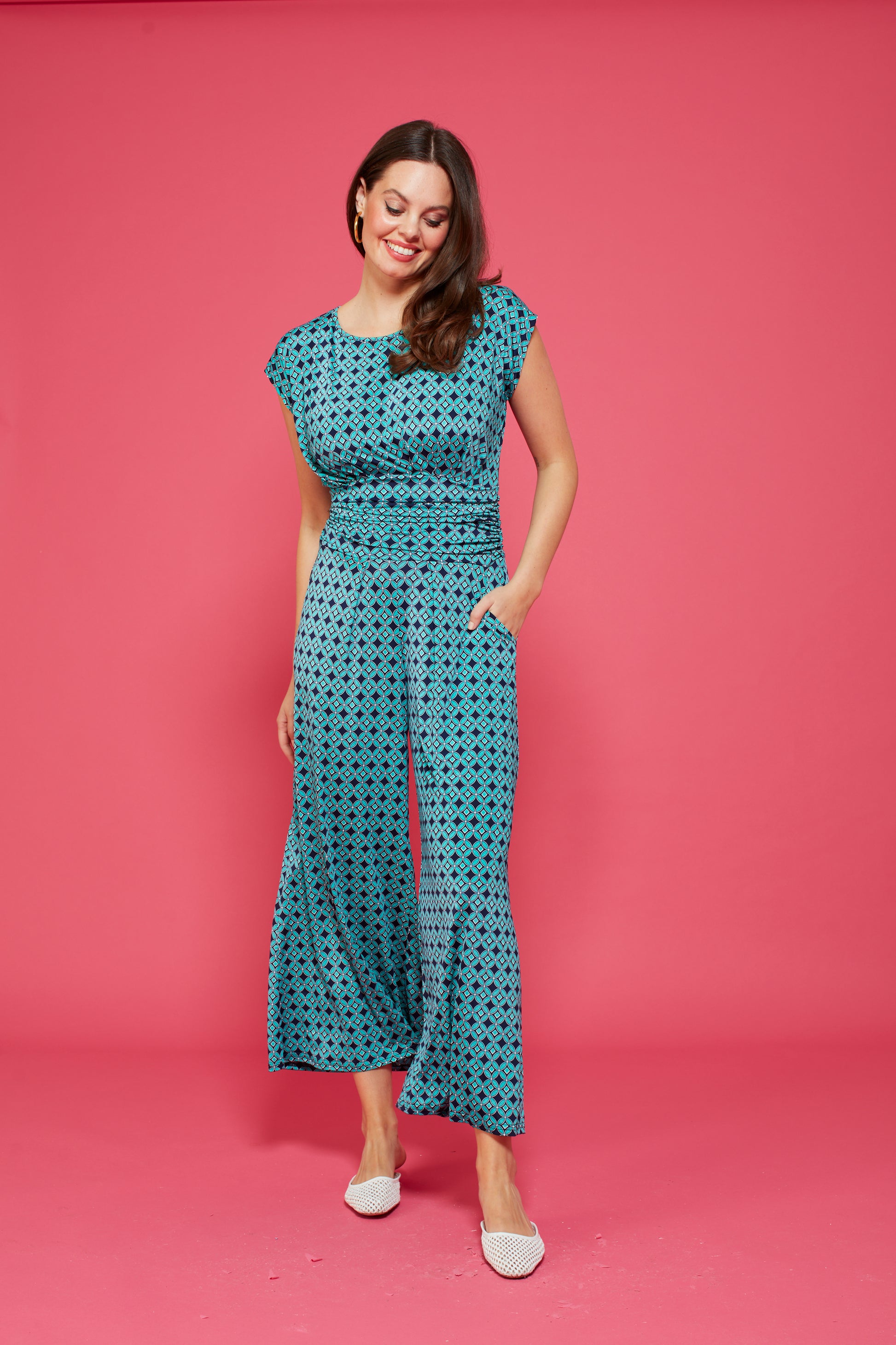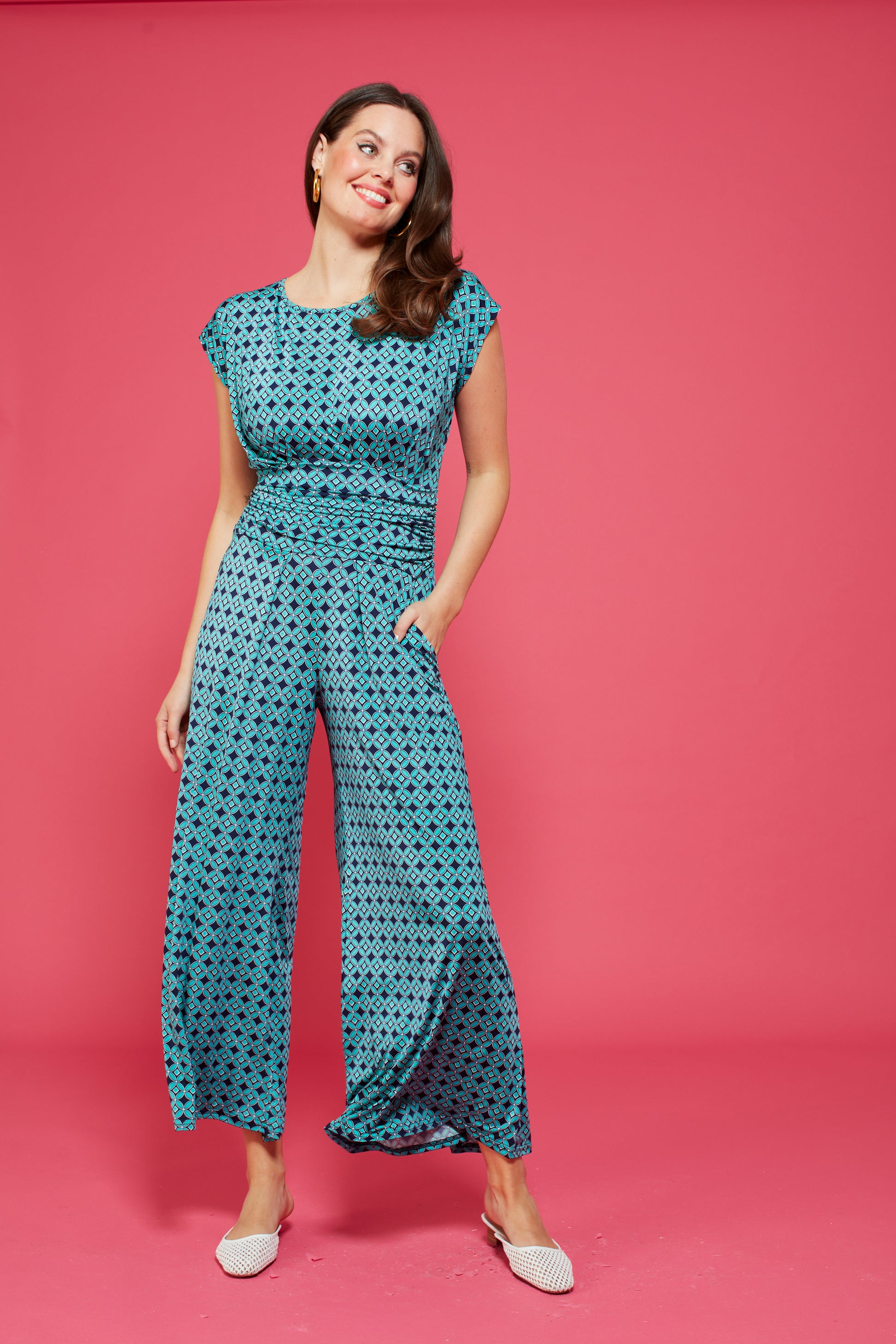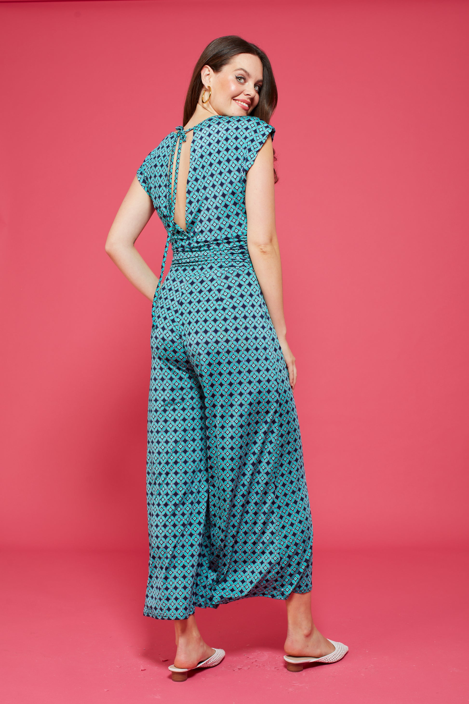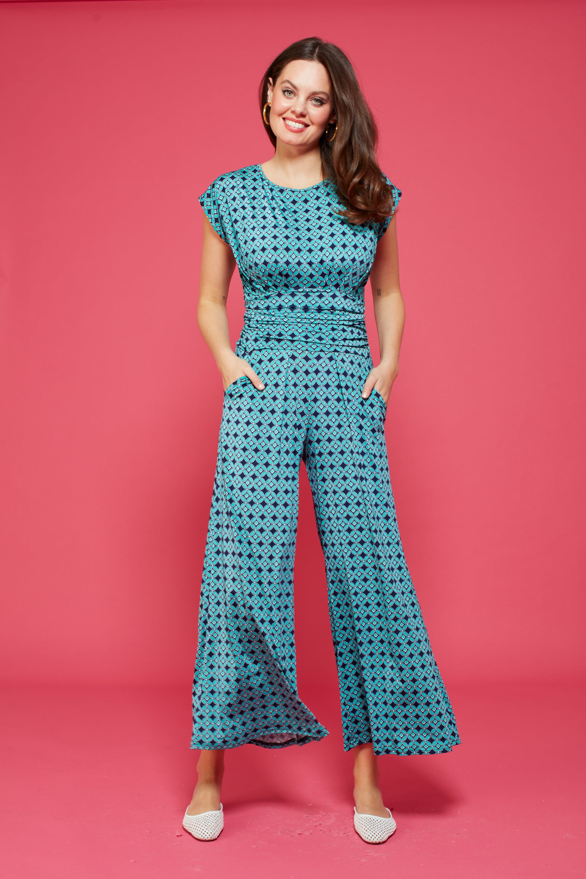 Introducing our new must-have summer piece: the Tasha Jumpsuit in Riad Turquoise! Effortlessly chic with a high neckline, cap sleeves, wide trousers, and pockets. The open back and stretchy fabric provide comfort and style all in one. Limited stock, get yours now!
