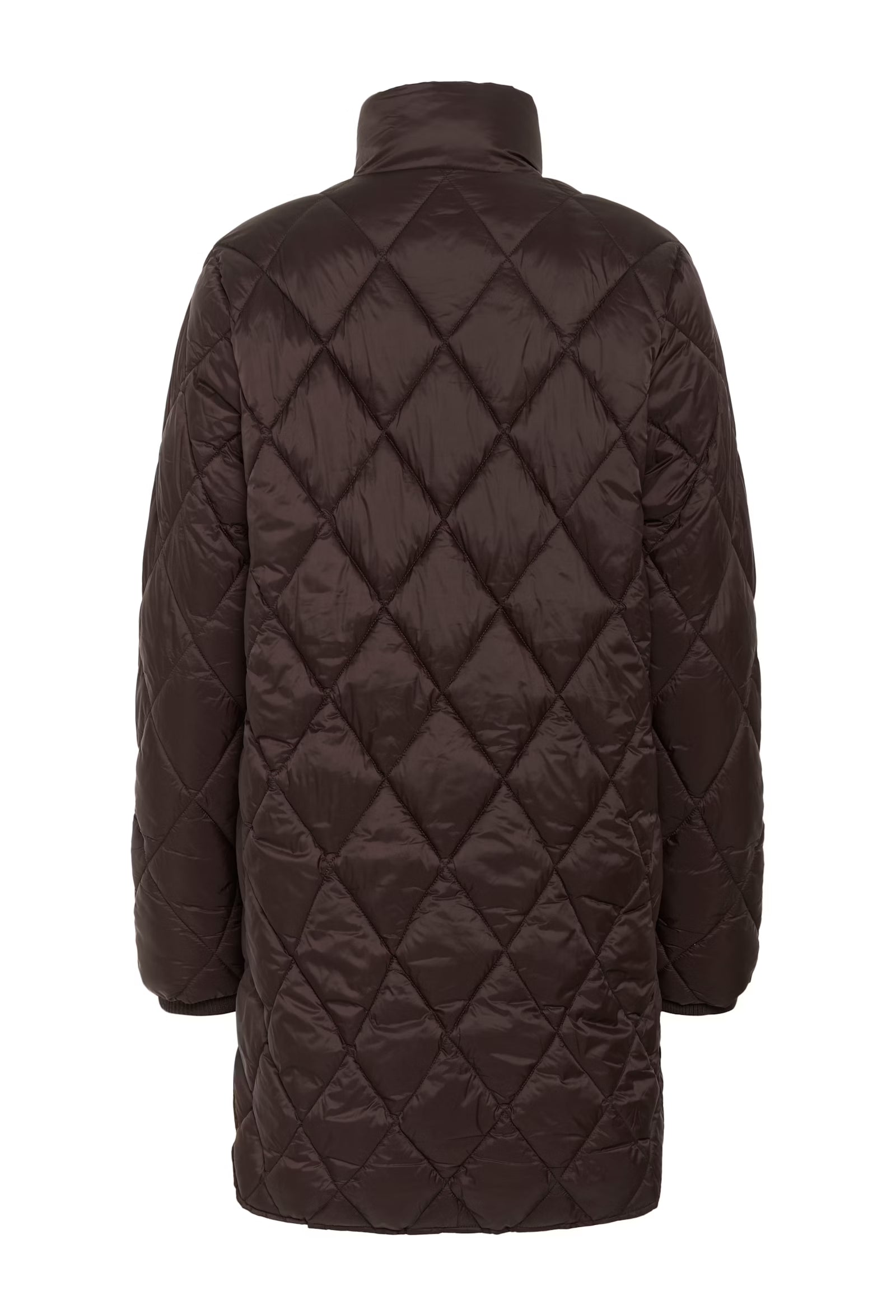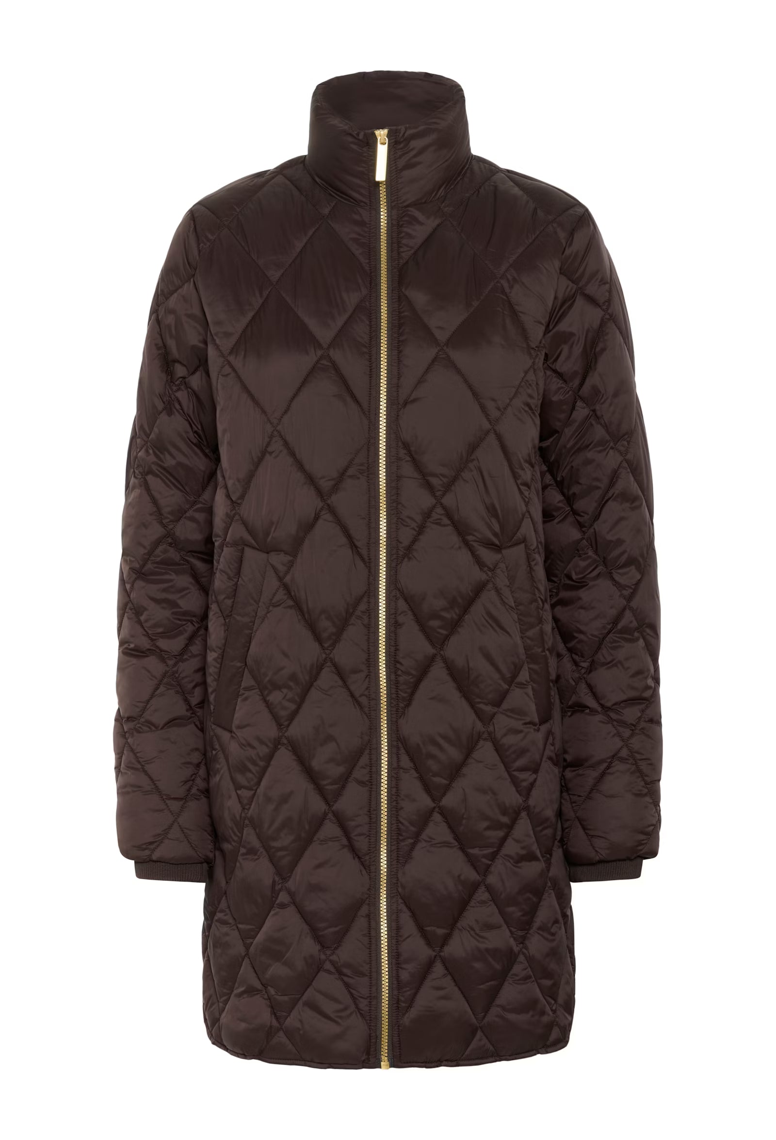 The model is 177 cm tall and wears a size 36. This long, lightly padded coat features a classic diamond quilted pattern and a high collar for extra protection against wind and cold. The sleek surface and gold-coloured zip add a modern touch. Ideal for transitional seasons and everyday wear.
