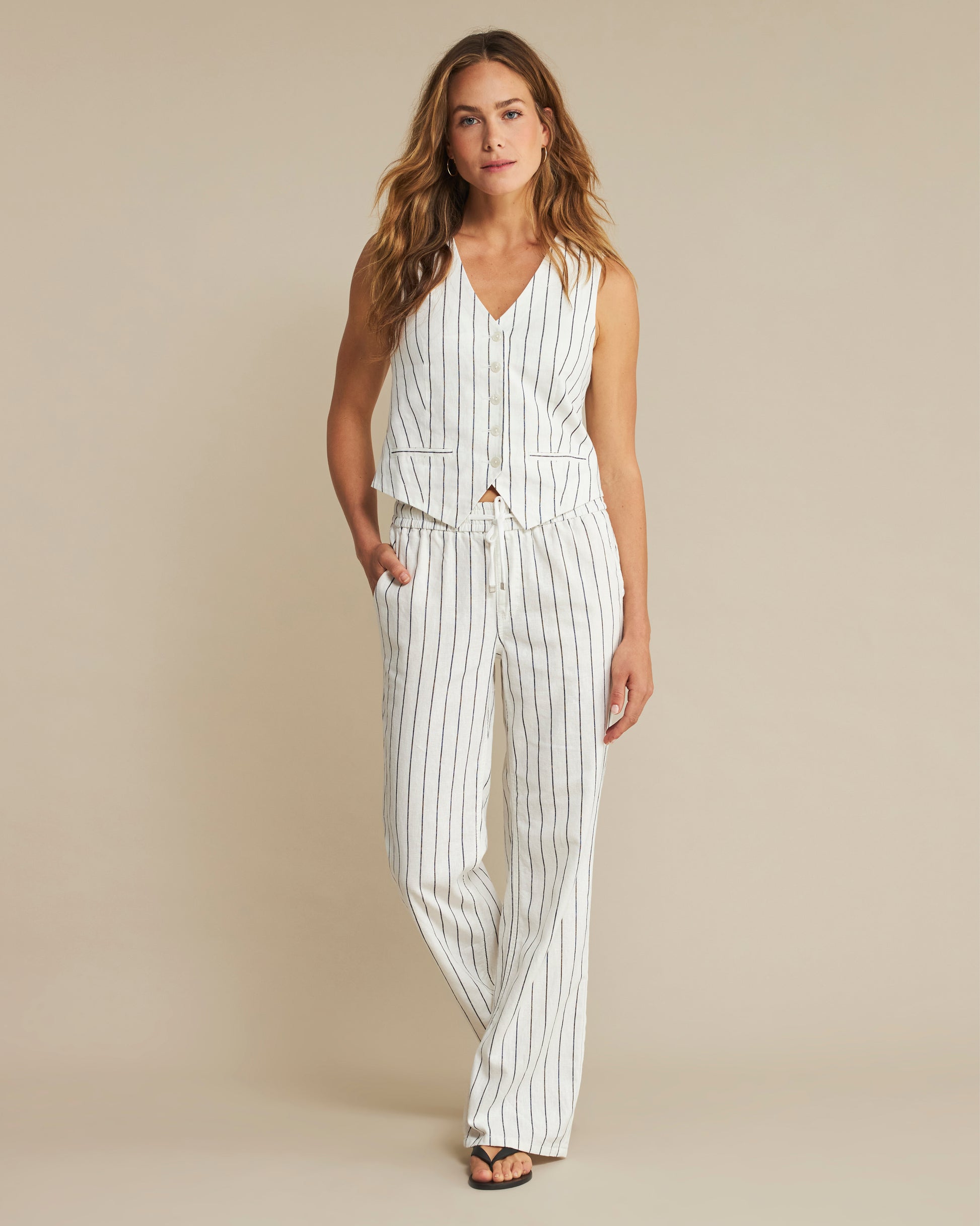 Elevate your wardrobe with this sophisticated Navy Linen Waistcoat by Red Button. Crafted from a premium blend of 55% linen and 45% BCI cotton, it offers breathable comfort with eco-conscious credentials. The classic 47cm center back length ensures a flattering fit that pairs perfectly with both casual and formal attire. An essential layering piece for the discerning dresser.