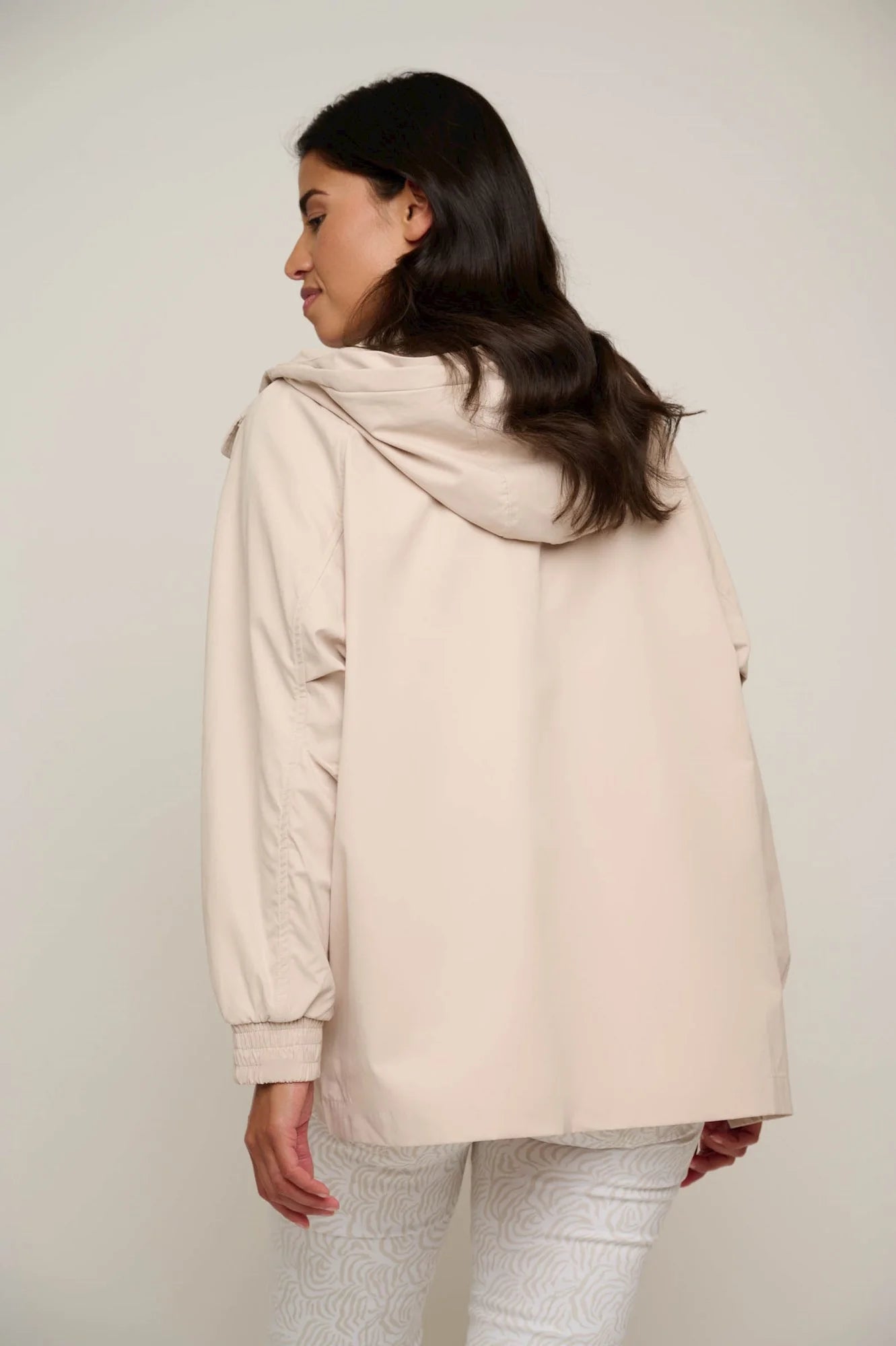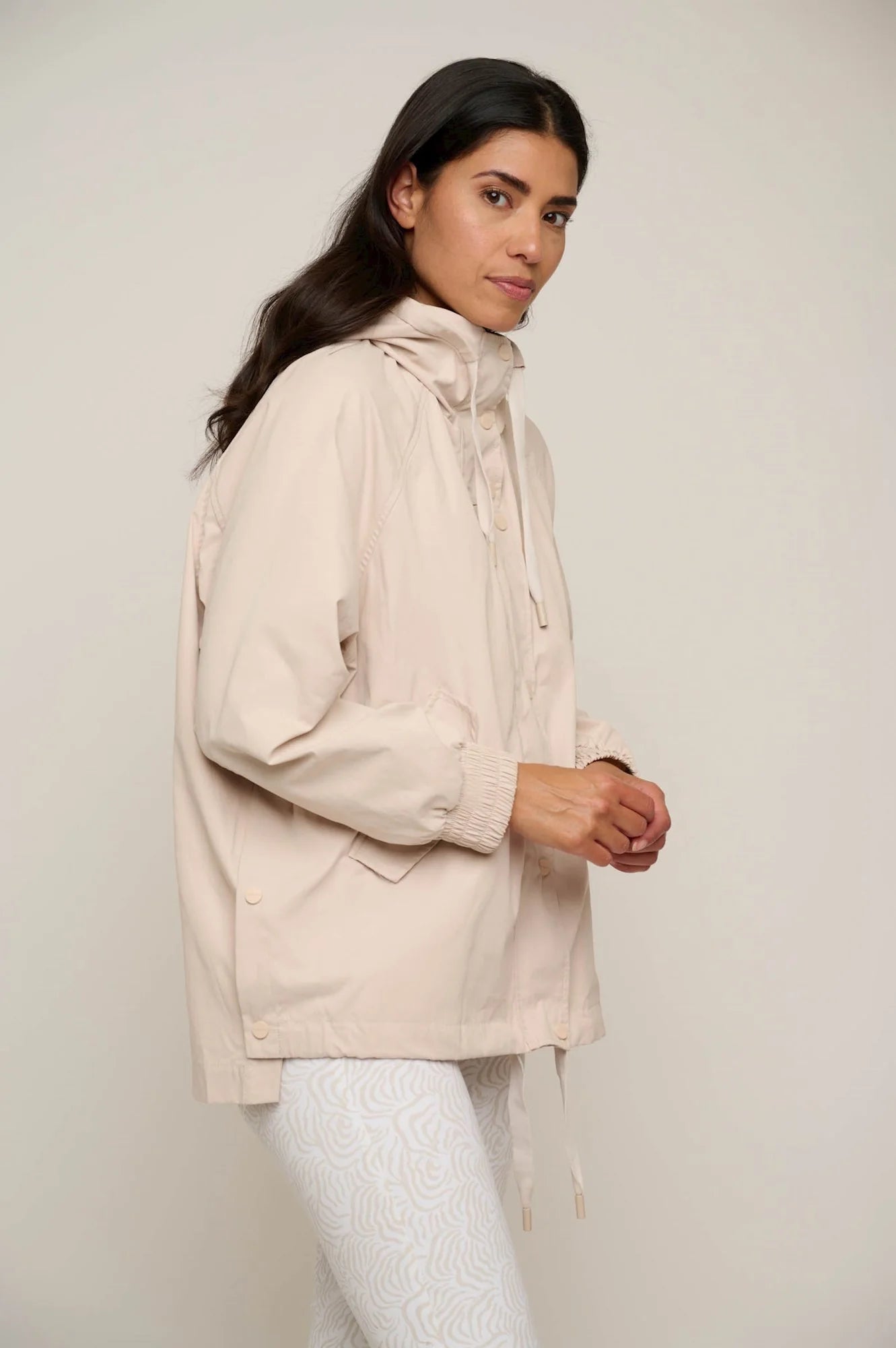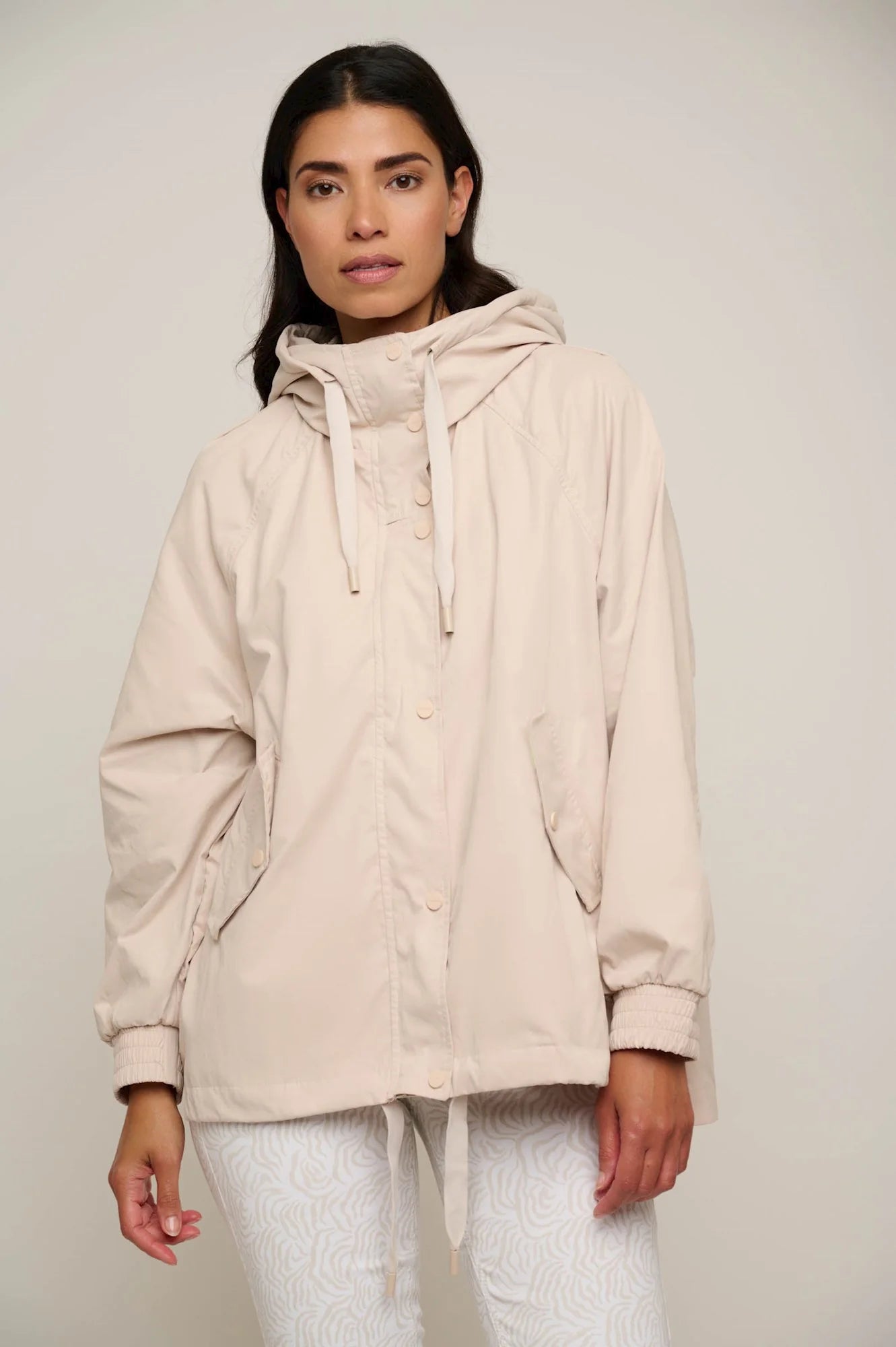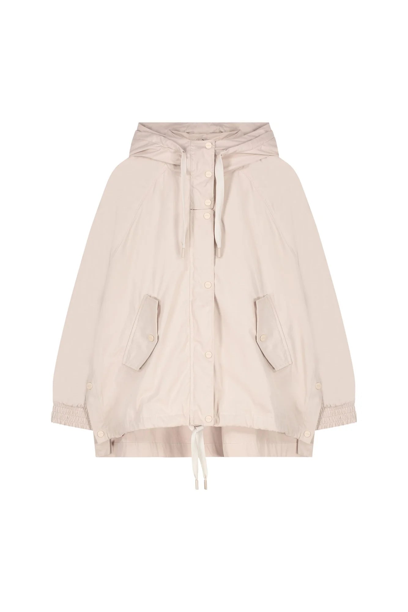 Rino & Pelle's short parka coat. This coat features a hood with drawstrings, a hidden zipper with snap button closure, two front pockets with snap button closure, elasticised cuffs and slit details with snap button closures on both sides. The coat has straps inside to tighten the waist and bottom. The model is 178 cm tall and is wearing a size (EU) 38.