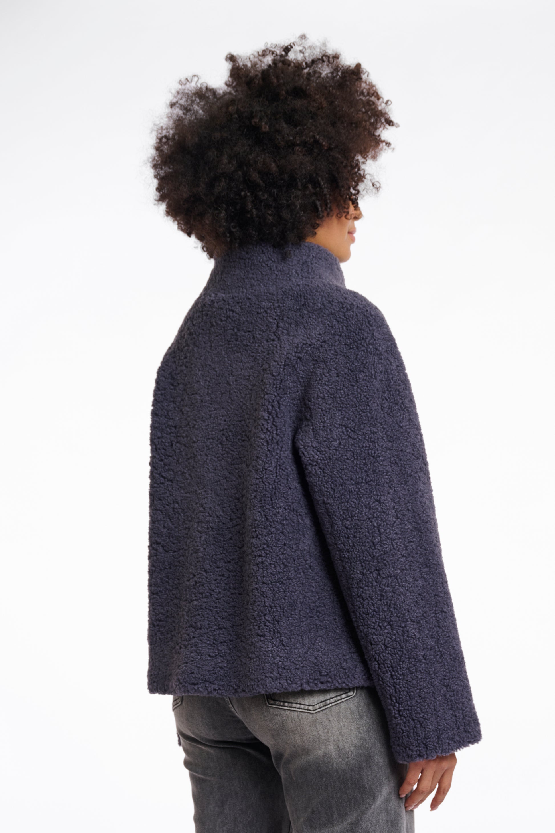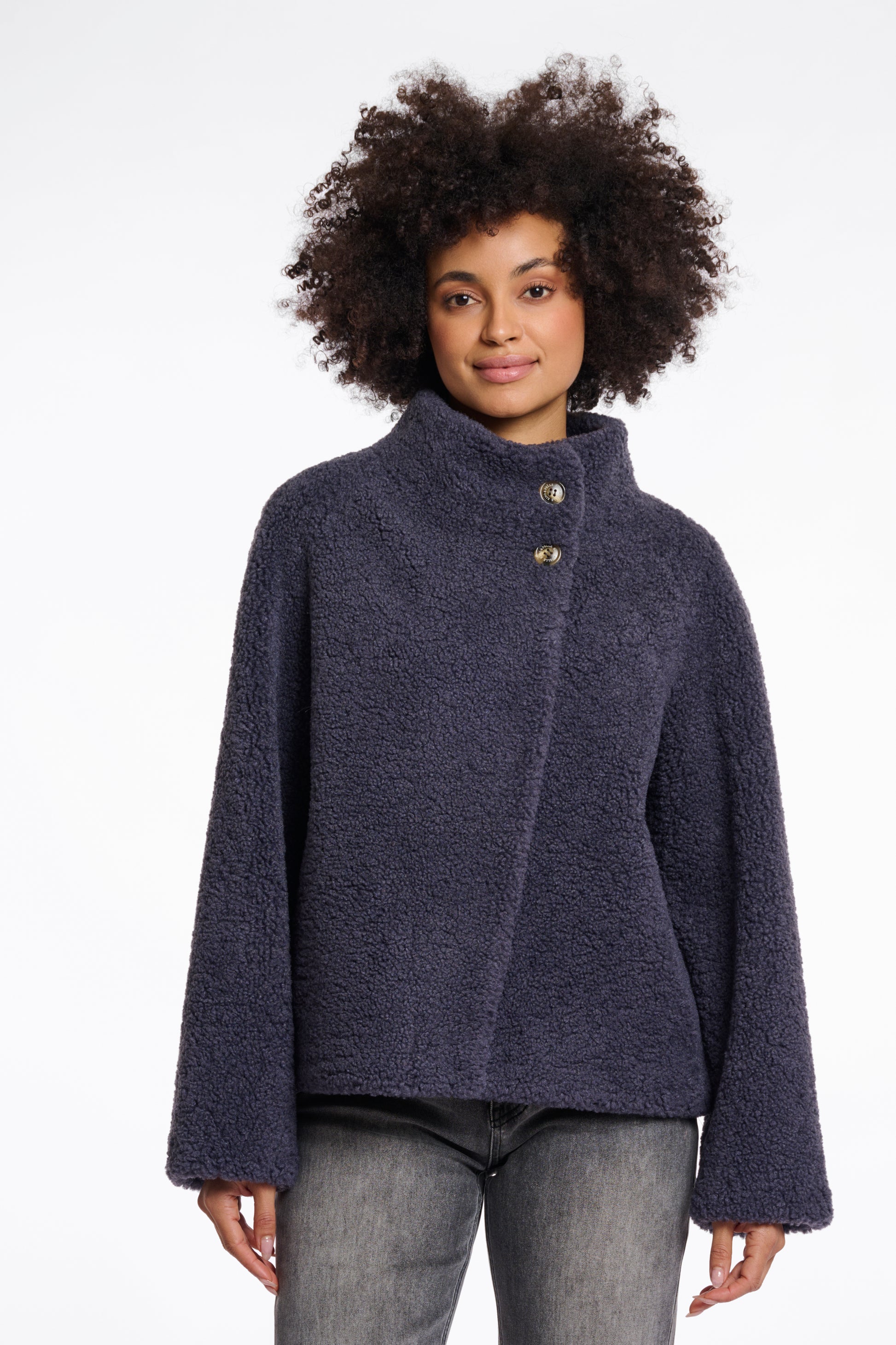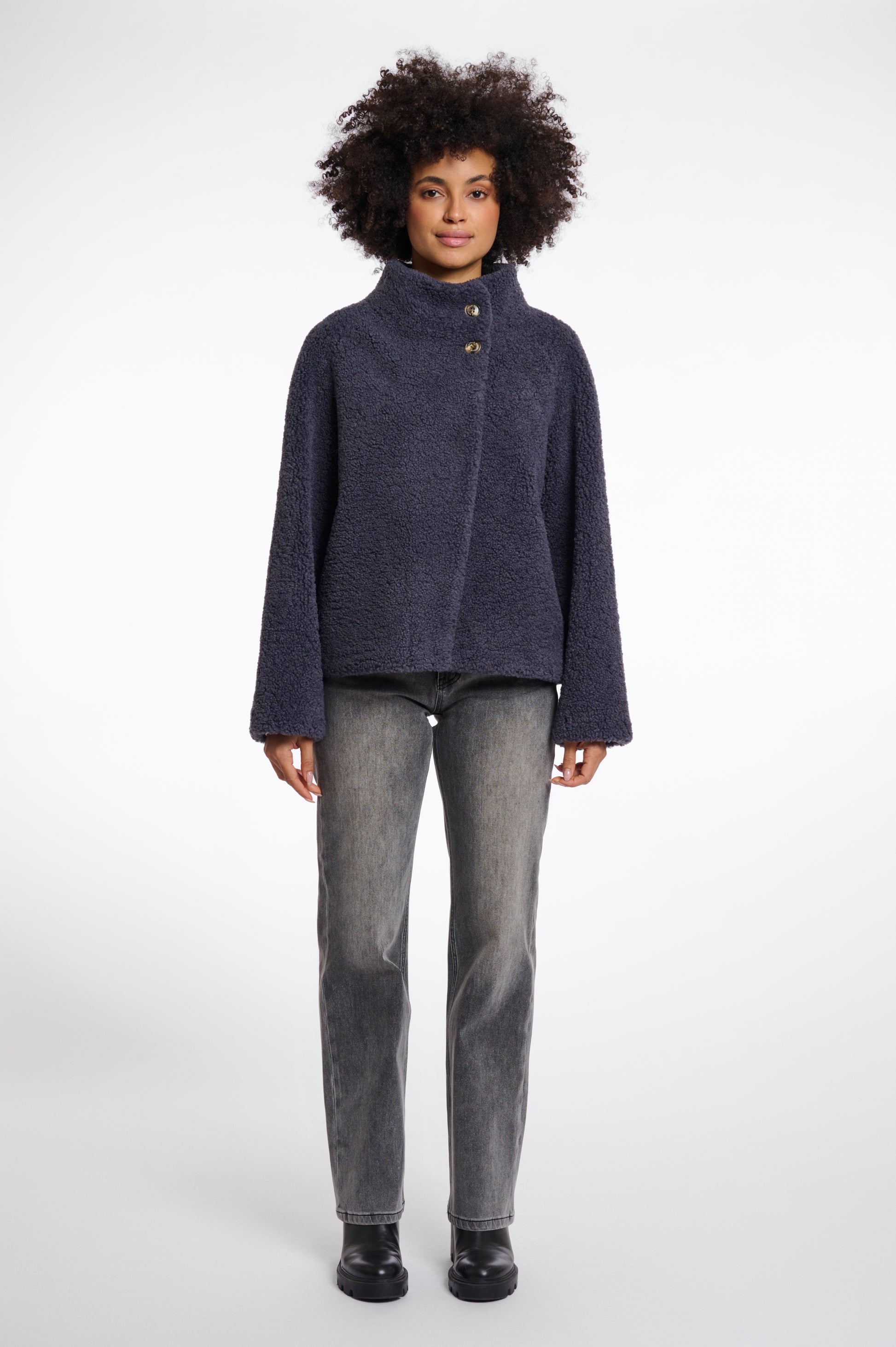 Elevate your style with this short teddy jacket. This chic piece features side slit pockets, a two-button top front, and a push button closure for convenience. The high stand-up collar adds a trendy touch to this versatile jacket. Embrace the season with this fashionable and functional addition to your wardrobe.