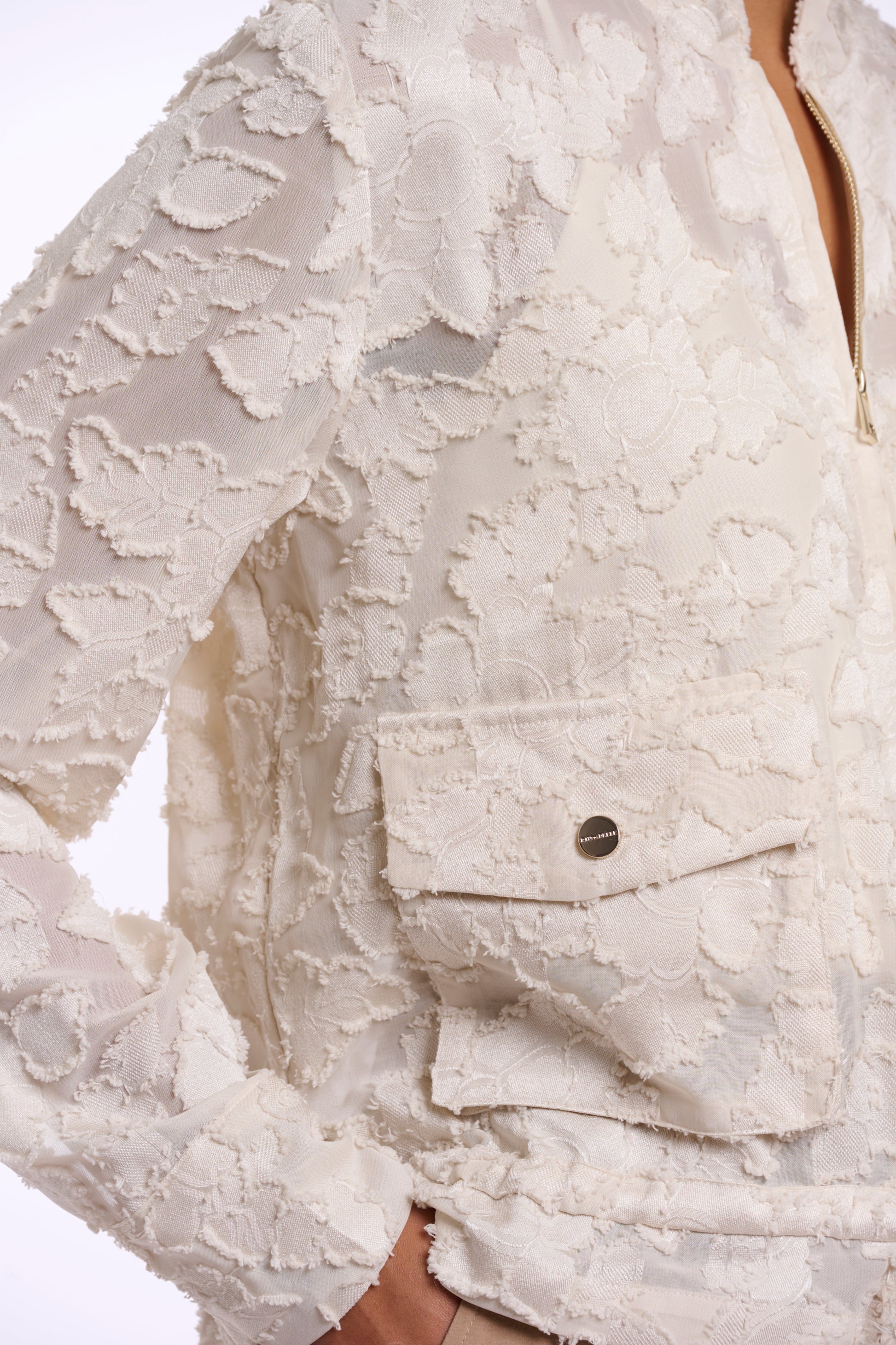 Elevate your look with this lightweight printed jacket, featuring a subtle floral pattern and a slightly sheer finish for an elegant, airy touch. Designed with a sleek zipper closure and two patch pockets with buttoned flaps, it blends modern utility with feminine ease. The adjustable drawstring hem allows you to shape the fit, making it a versatile piece for refined, contemporary styling.