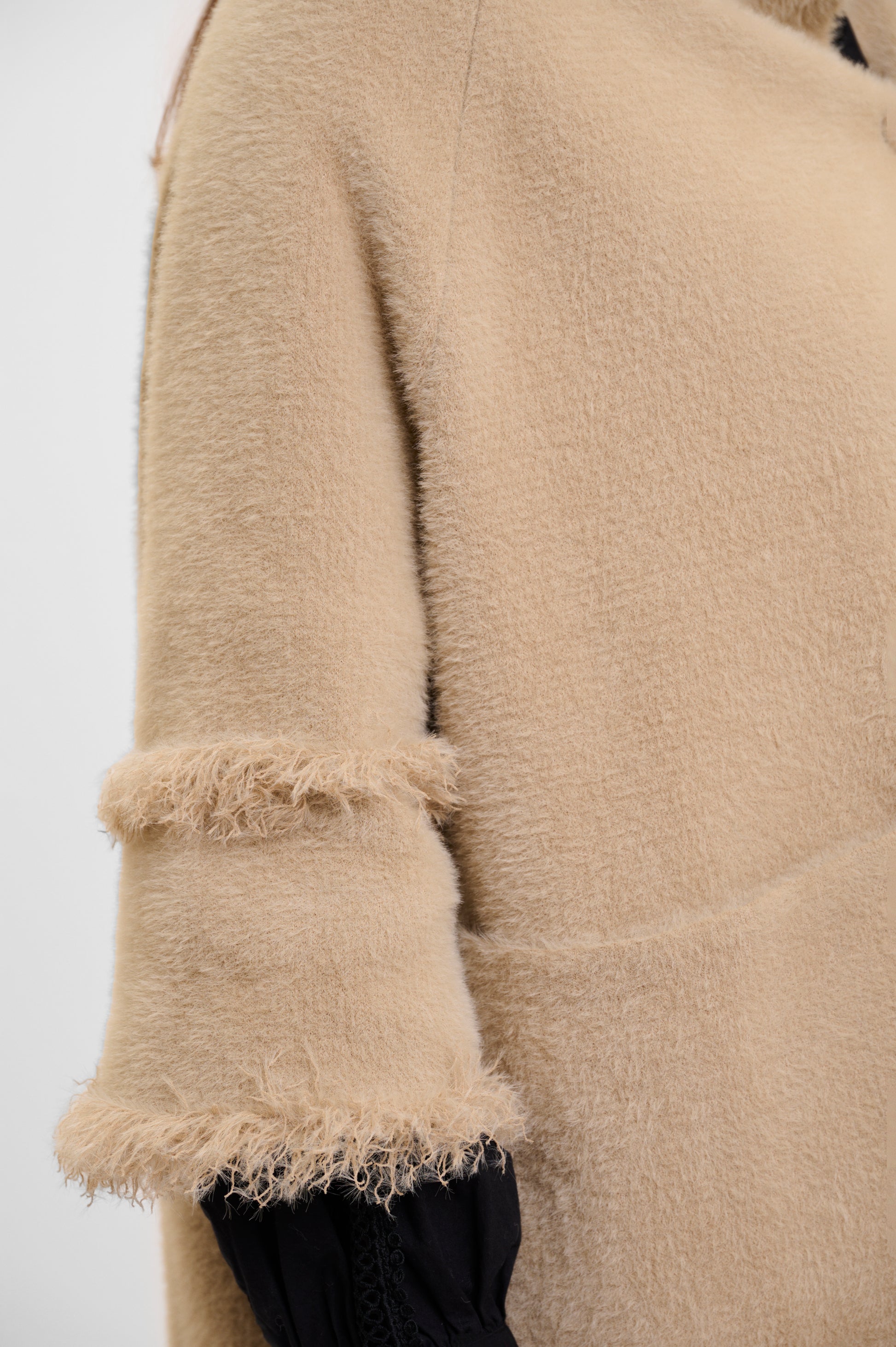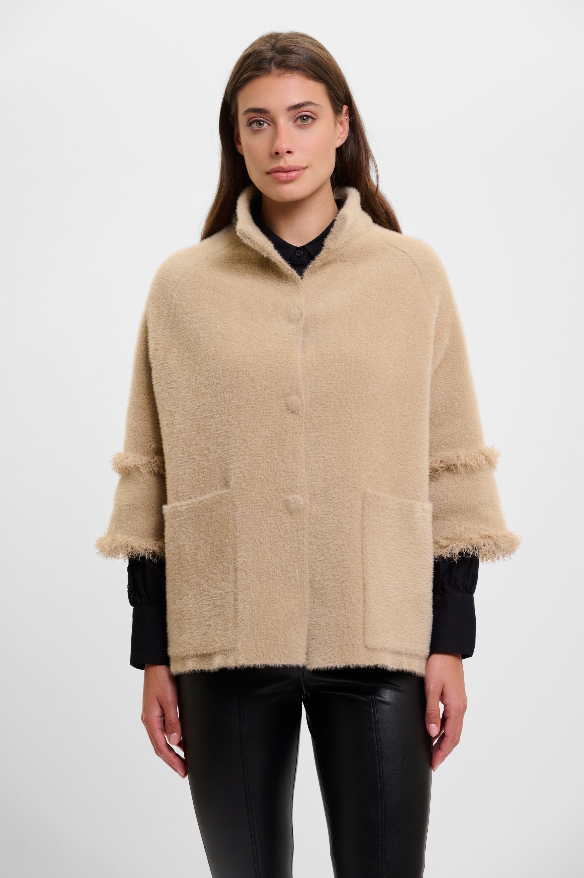 Indulge in luxurious comfort and style with the Sabe Cape in Desert by Rino & Pelle. This short knitted jacket boasts a unique cape look with stunning fringe details. Keep warm and chic with the stand up collar, button fastening, and practical front pockets. A must-have for a cozy and fashionable outfit!