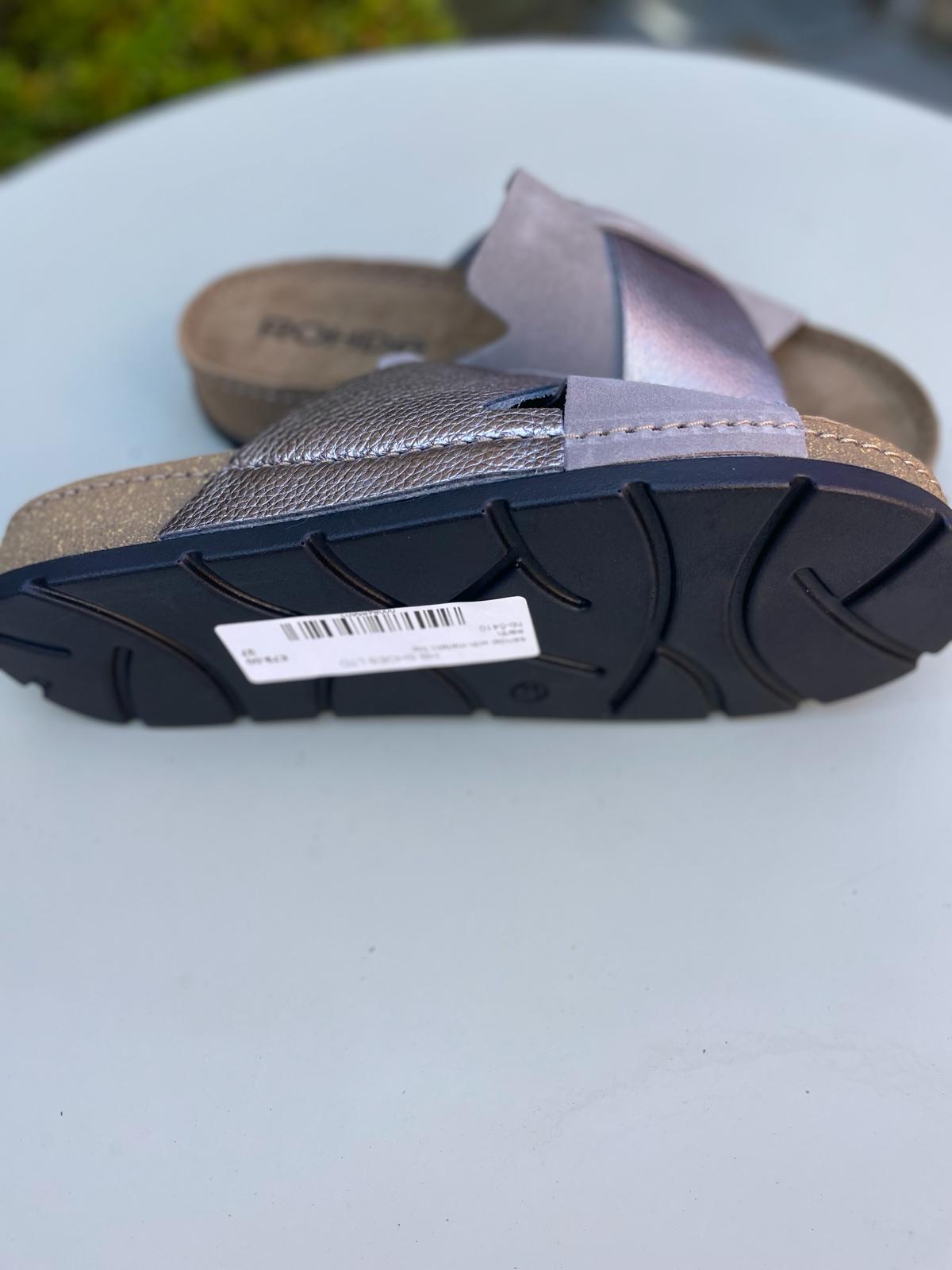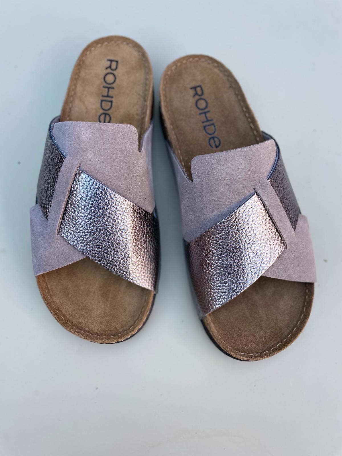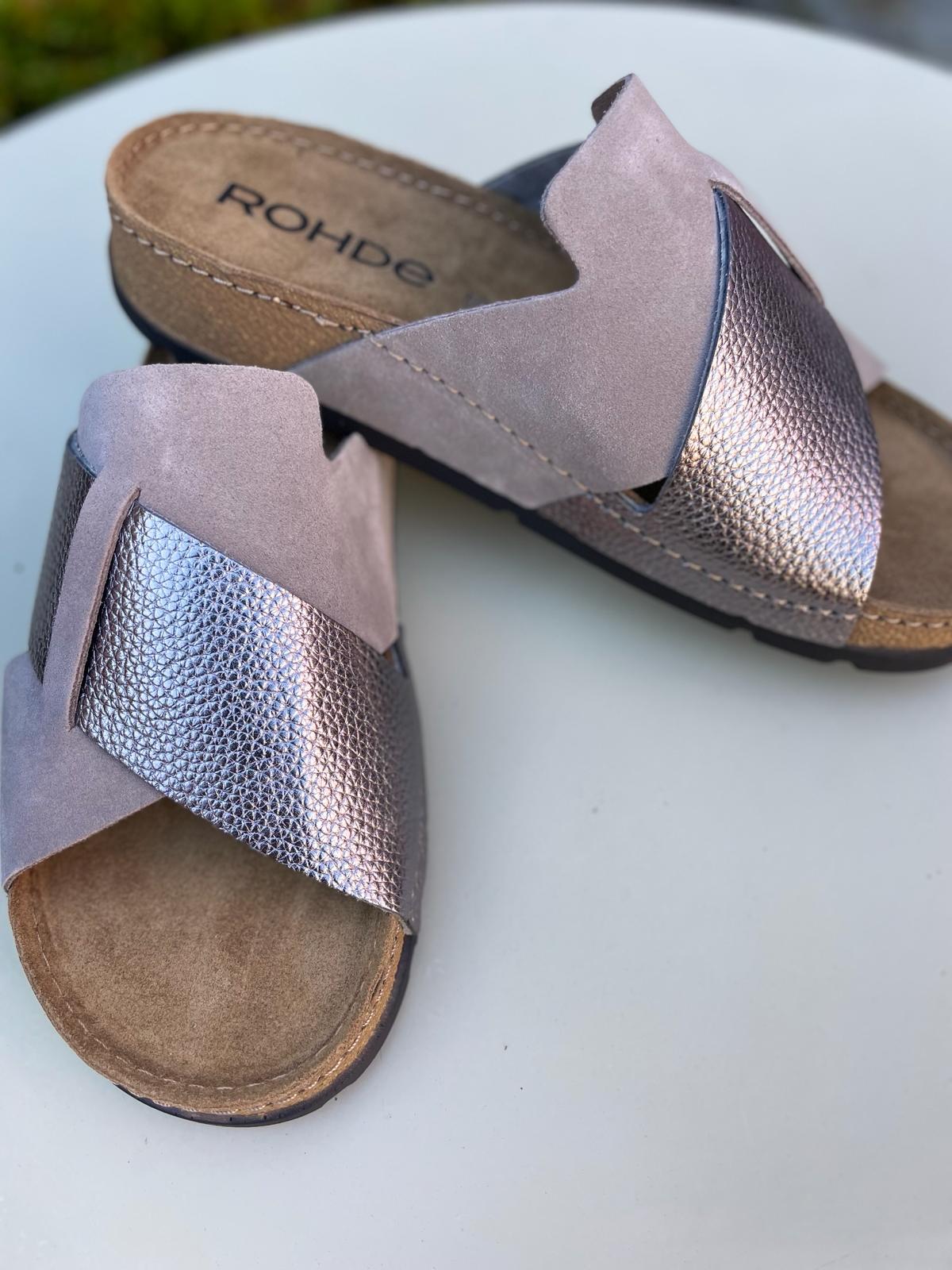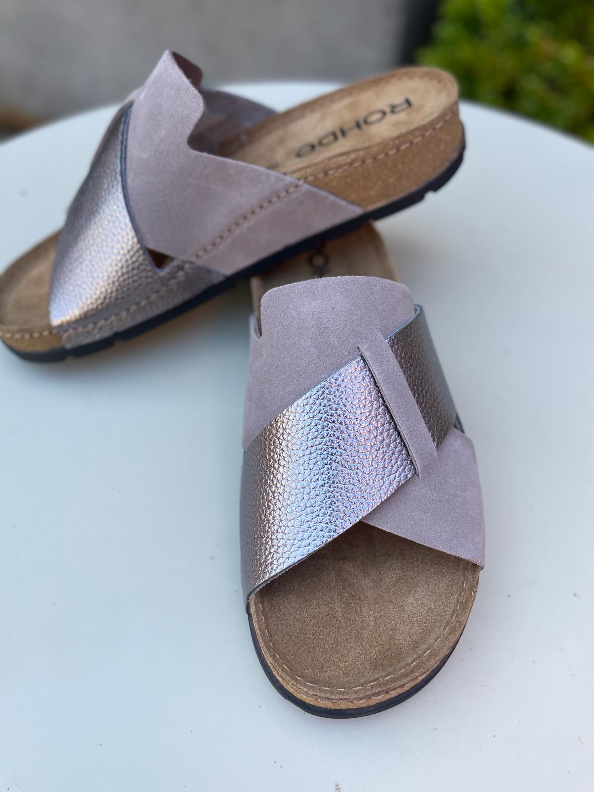 Elevate your style with the Cross Over Sandal in Earth from Rohde. Made with luxurious nubuck leather and a metallic pebbled strap, this mule features intricate stitching and a comfortable nubuck leather insole. Enjoy the ultimate blend of comfort and style with this earthy pewter shoe.