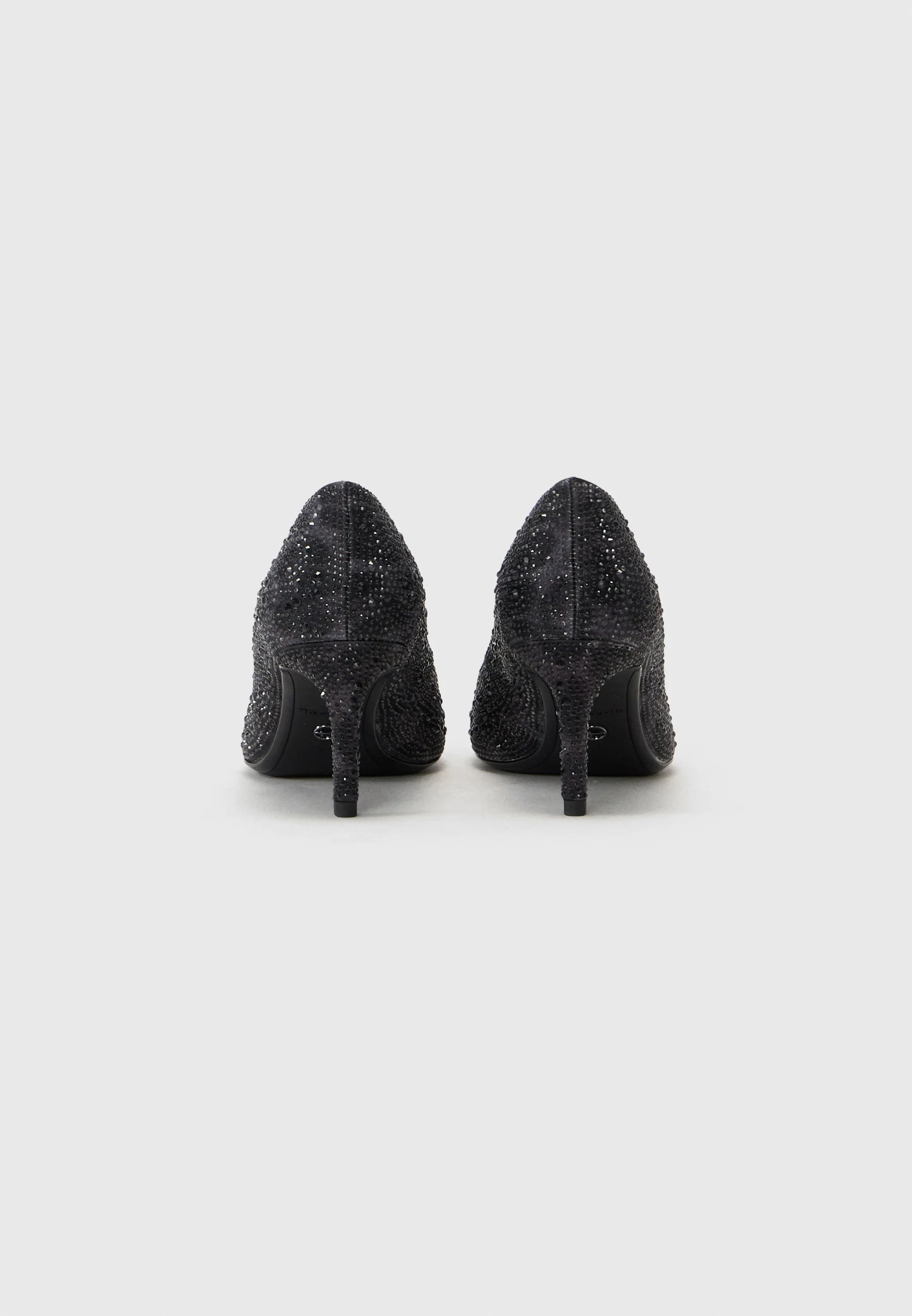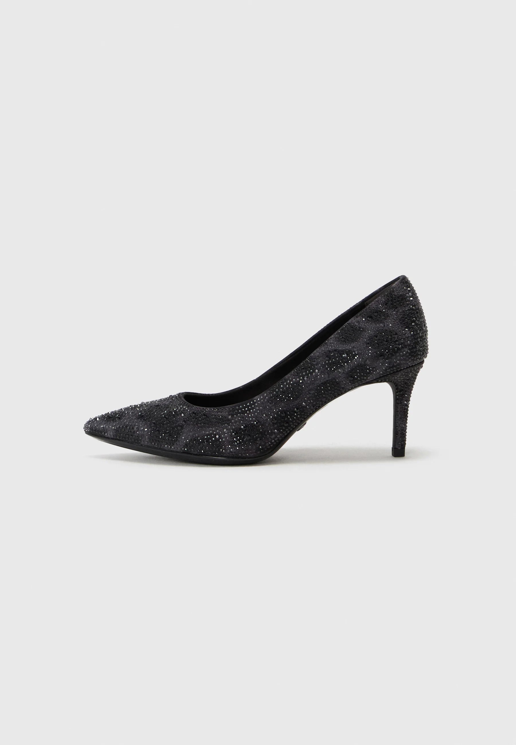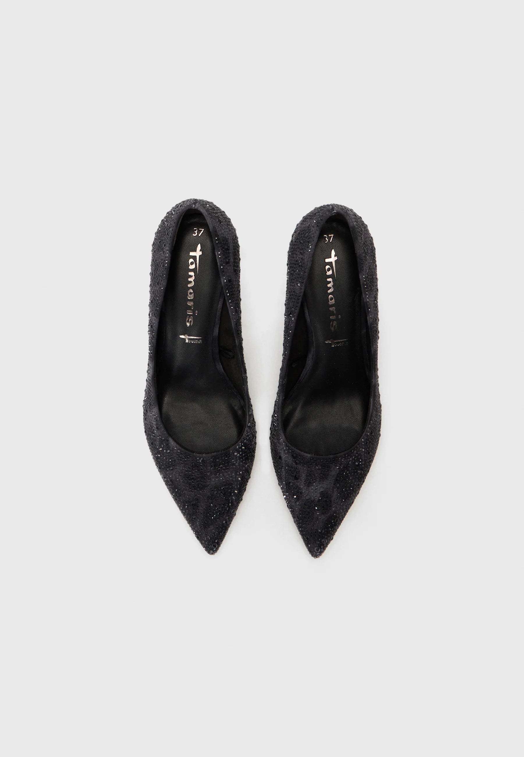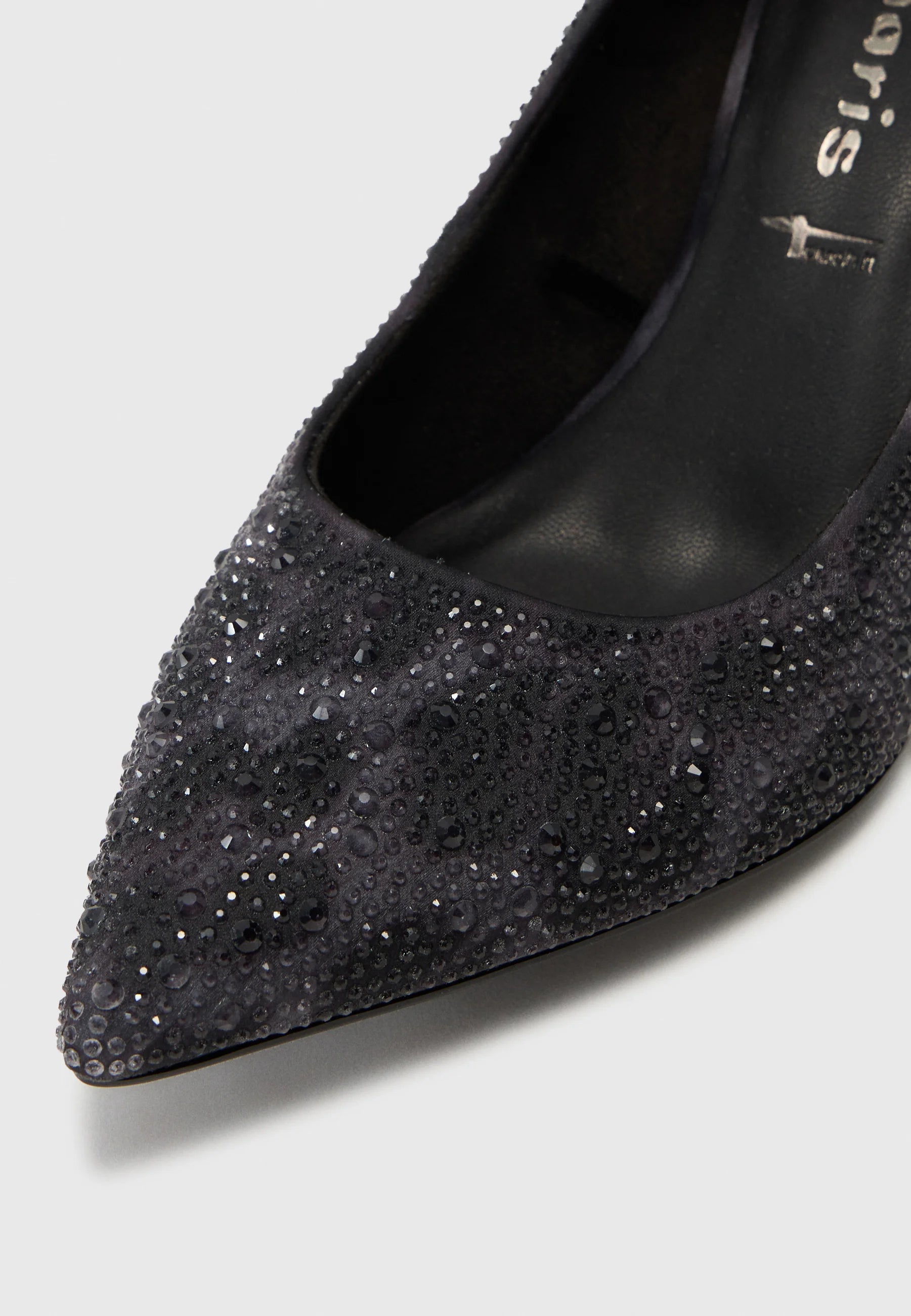 Step out in style with the Tamaris Classic Heels in Grey Leopard. Featuring a sleek pointed toe and elegant stiletto heel, these slip-on shoes combine bold animal print with sparkling rhinestone details for a striking look. Perfect for adding a touch of glamour to any outfit, they offer both sophistication and effortless wearability. Elevate your wardrobe with these eye-catching heels designed to turn heads wherever you go.
