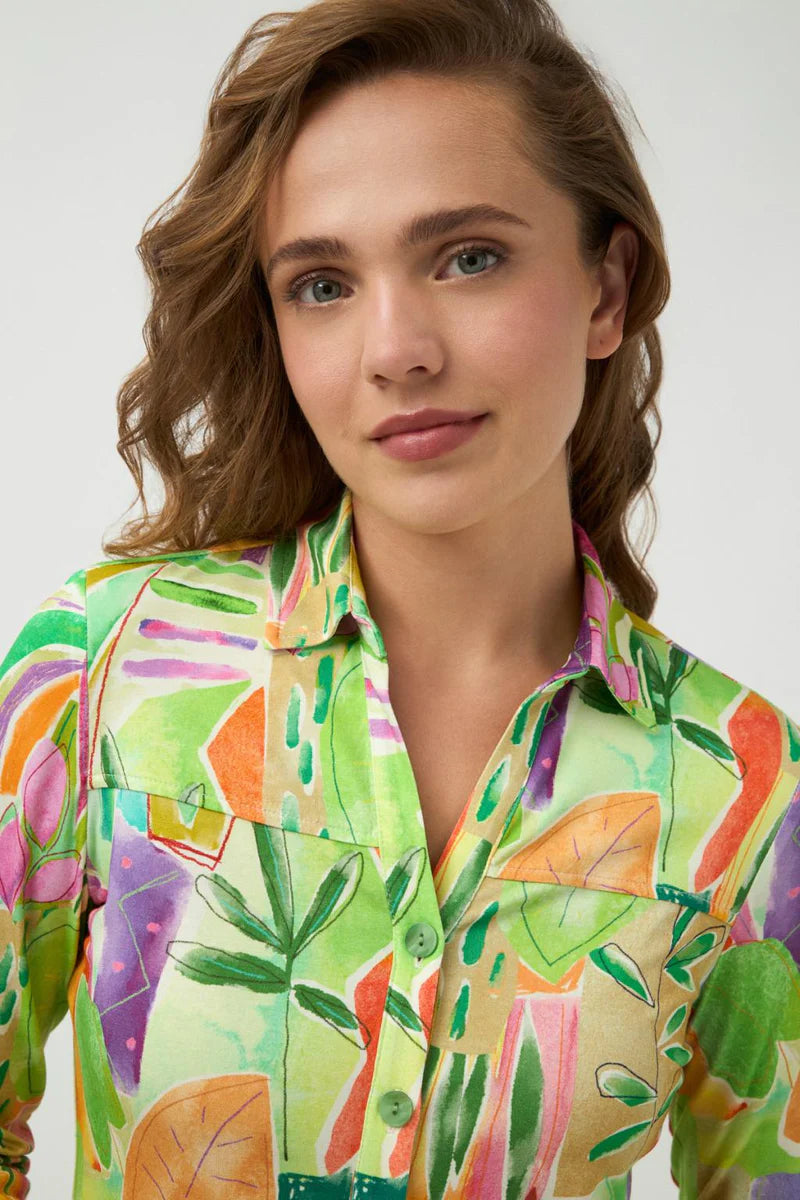 Introducing the Anto Shirt in Lima, a tropical print shirt made of stretch jersey fabric, designed and manufactured in Spain by Tinta & Bariloche. Enjoy the soft and lightweight feel with a shirt collar, buttoned cuffs, and front closure. Perfect for a stylish and comfortable look.