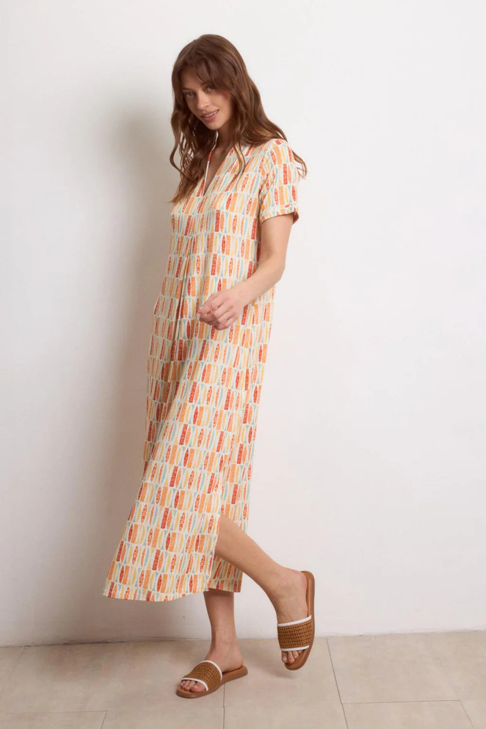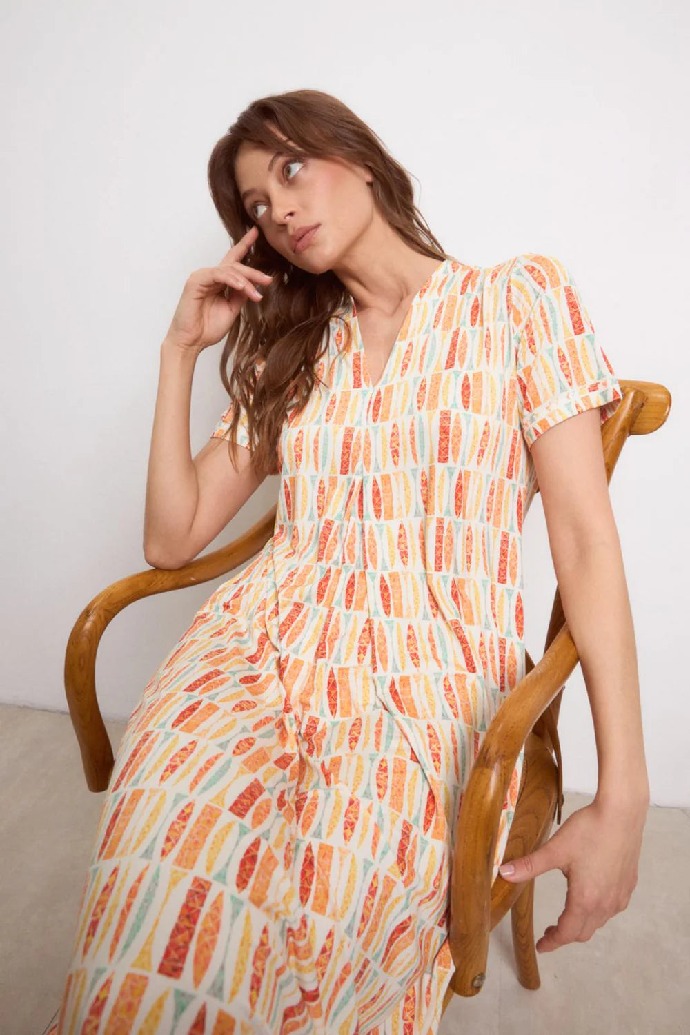 Transform your look with the captivating Tropea mand dress by Tinta & Bariloche. This long printed masterpiece features an irresistibly flowing fabric that's both soft against your skin and lightweight for all-day comfort. The loose fit drapes beautifully over your silhouette, while the distinctive round neck with crossover V-neckline creates a flattering center gather that draws the eye. Complete with practical short sleeves and a clean straight hem, this dress effortlessly combines sophistication with ease—perfect for making an unforgettable impression at any occasion.