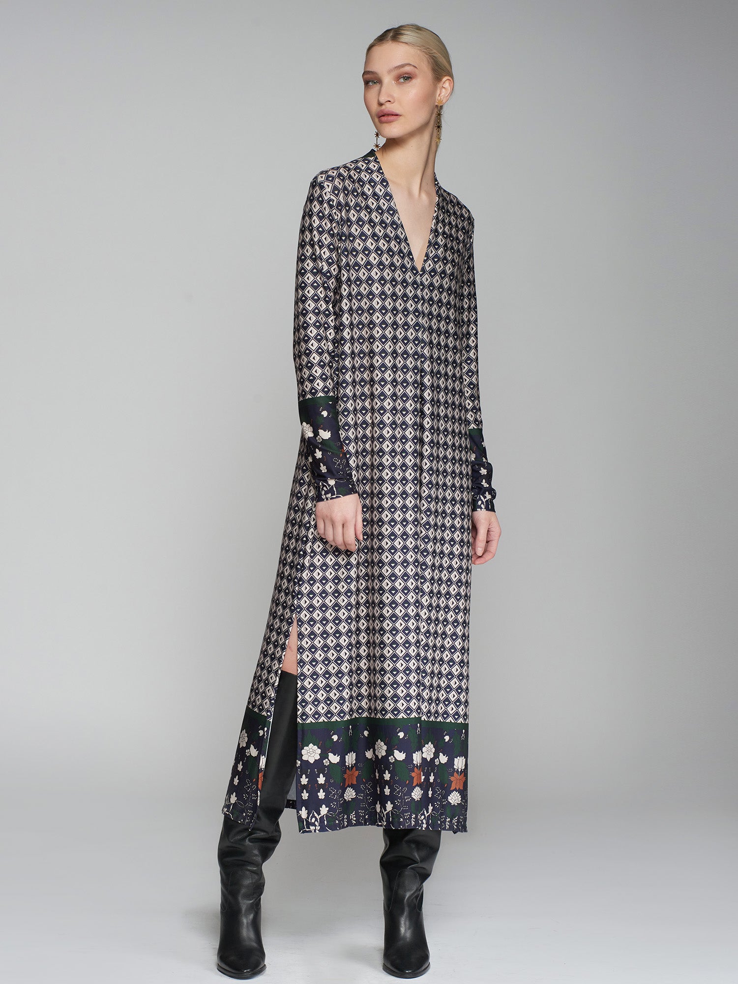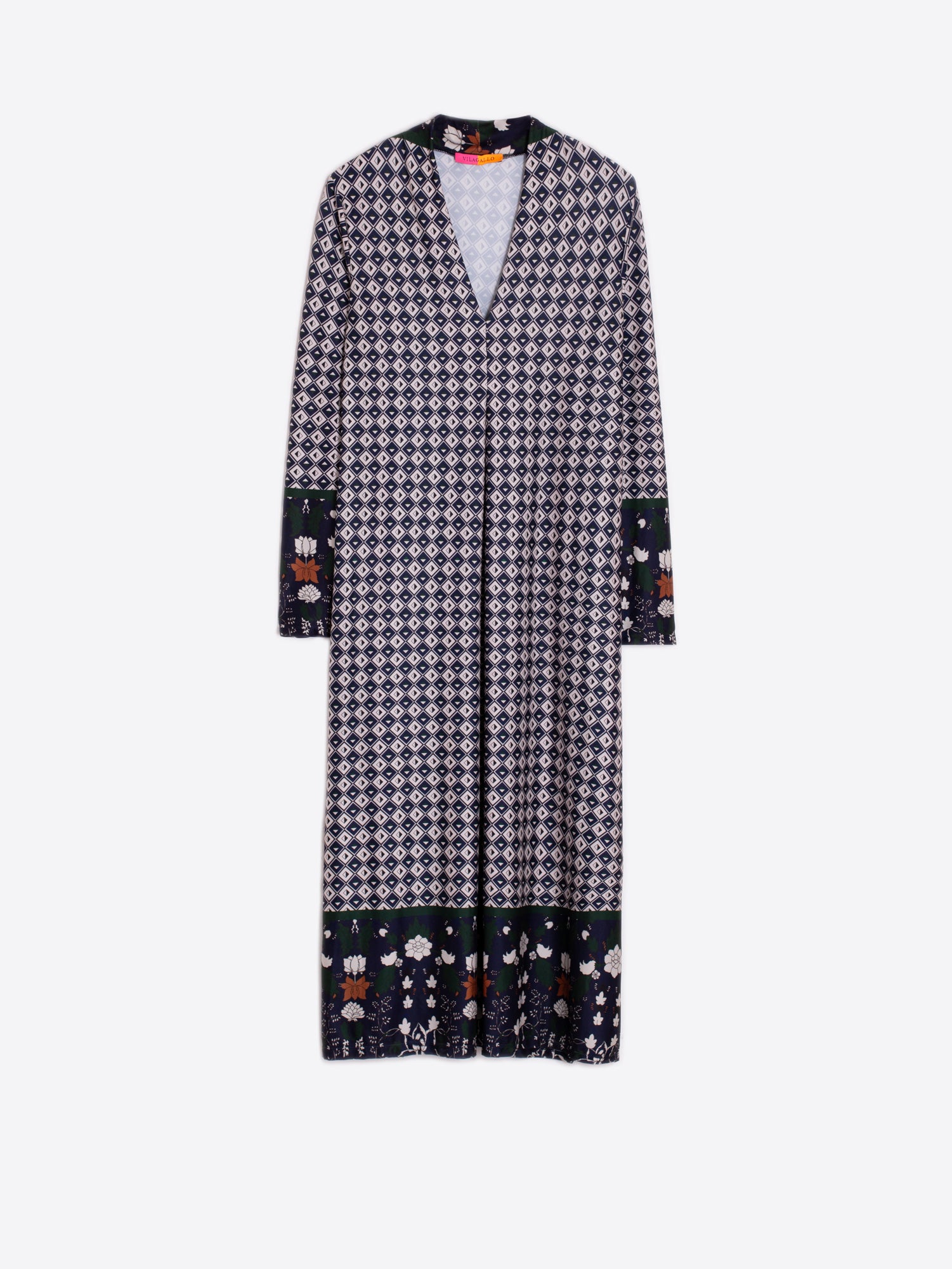 Experience bold style with our V-Neck Dress in Geometric. The deep V-Neck creates a flattering silhouette, while the eye-catching geometric pattern adds a touch of elegance. Designed by Vilagallo for a unique and chic look.