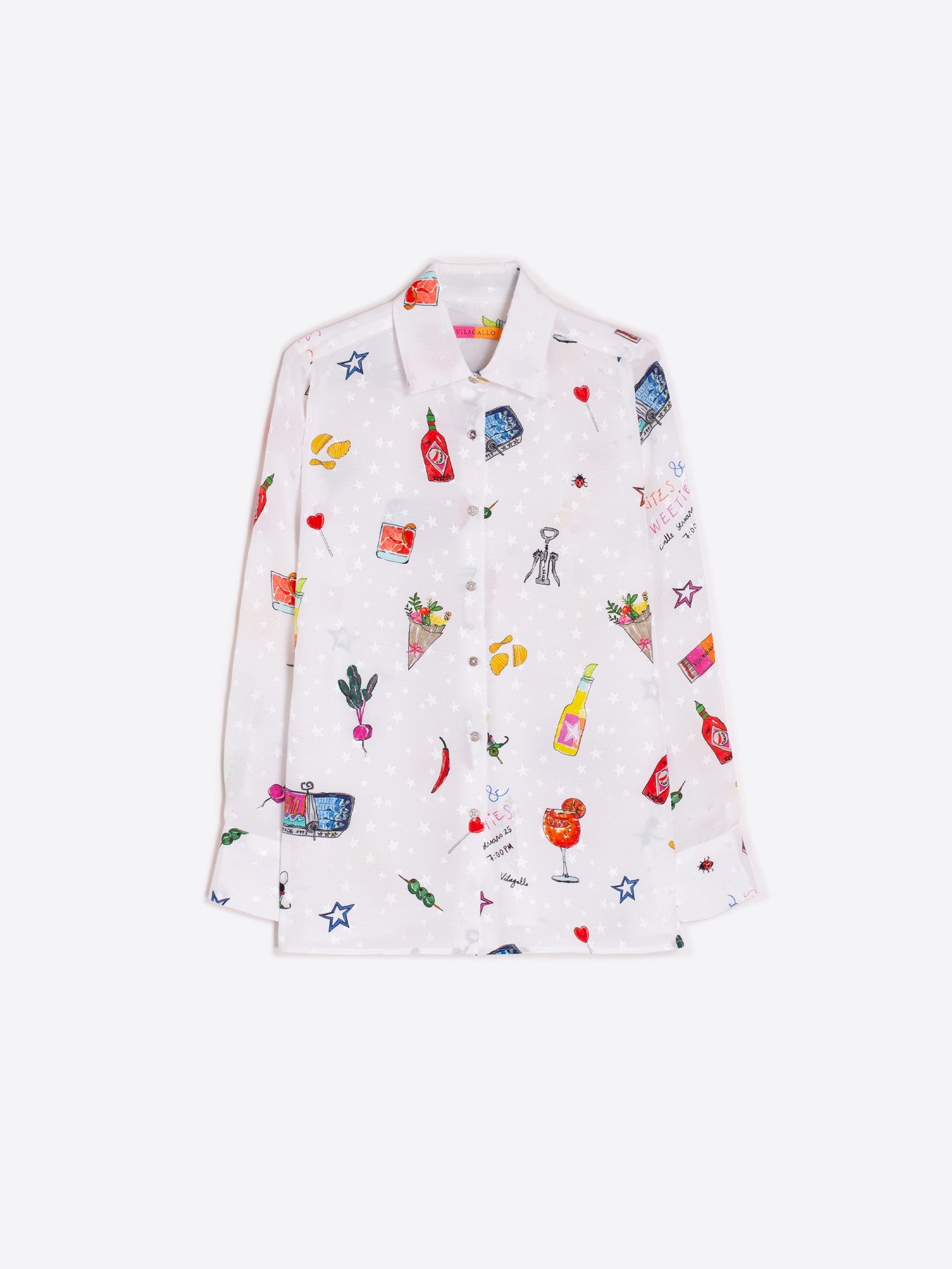 Elevate your style with the Mariela Aperitivo Print Shirt by Vilagallo. This flowing white shirt features a unique combination of jacquard stars and exclusive Vilagallo snack patterns, perfect for making a statement. The front metal buttons add a touch of sophistication, while the long sleeves with cuffs provide a comfortable fit. Available in size 38 and worn by our model, this shirt is sure to add a touch of personality to any outfit.