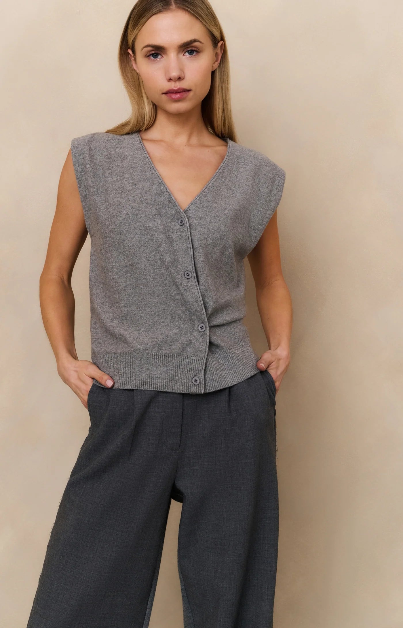 This soft knitted gilet features a sleeveless design, deep V-neck and an eye-catching asymmetric button closure. The regular fit and wide ribbed hem add a modern, layered feel. Ideal for styling over a blouse or dress for a refined and stylish look. The model is 176 cm and wears size S.