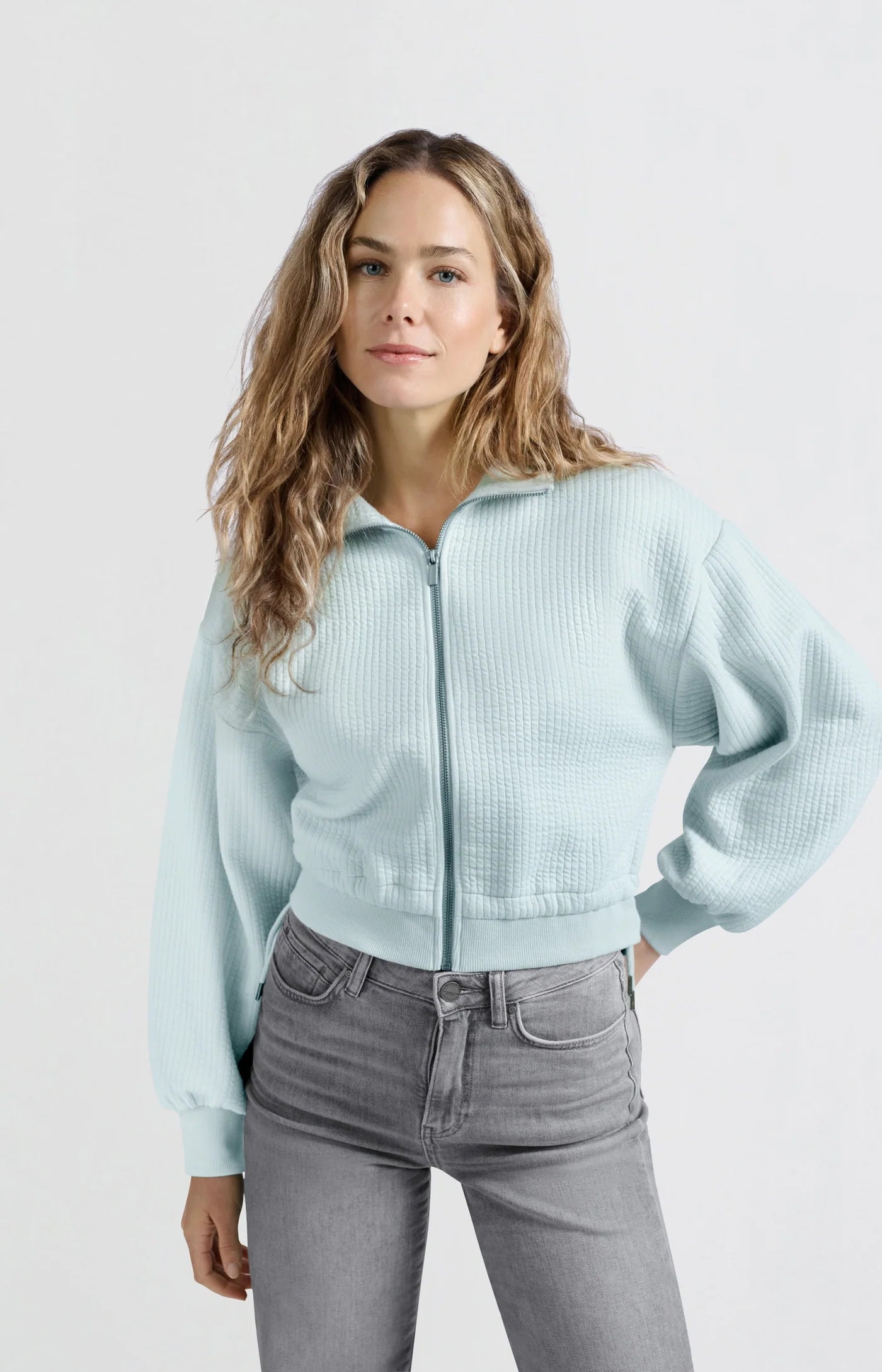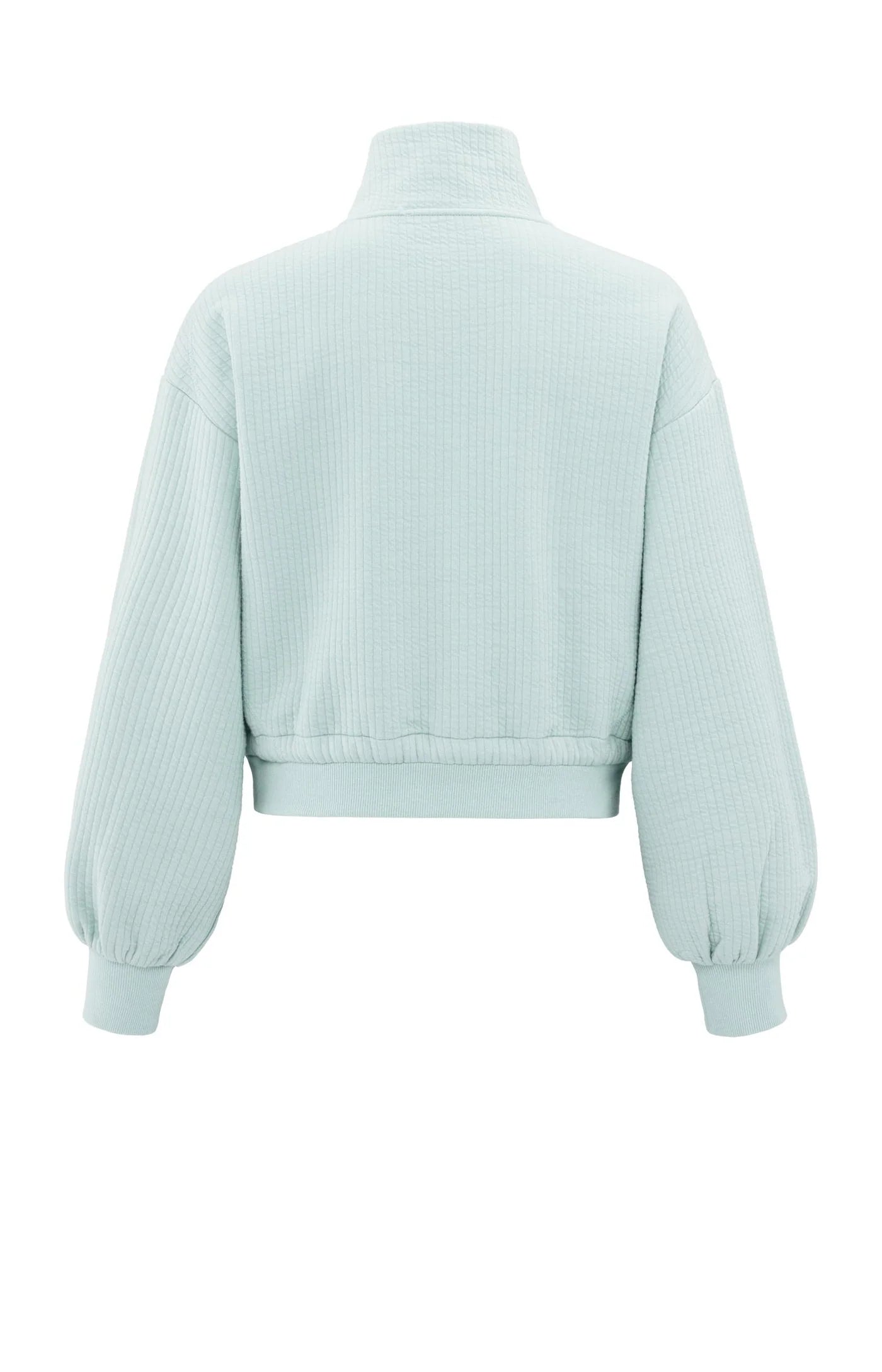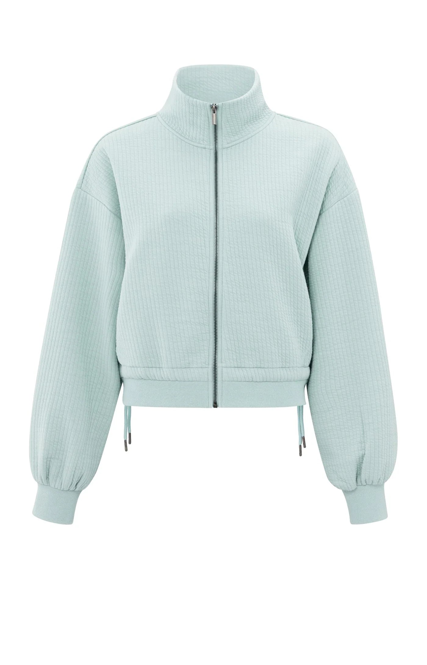 Elevate your wardrobe with the YAYA Ribbed Jersey Zip-up Sweater in Grey. Crafted from a ribbed jersey fabric, this cardigan boasts a zipper closure, stand-up collar, and balloon sleeves for a modern touch. Its wide cuffs and subtle cords offer a comfortable and tailored fit. This versatile piece is perfect for both casual and chic looks. Model is 178cm and wearing size S.