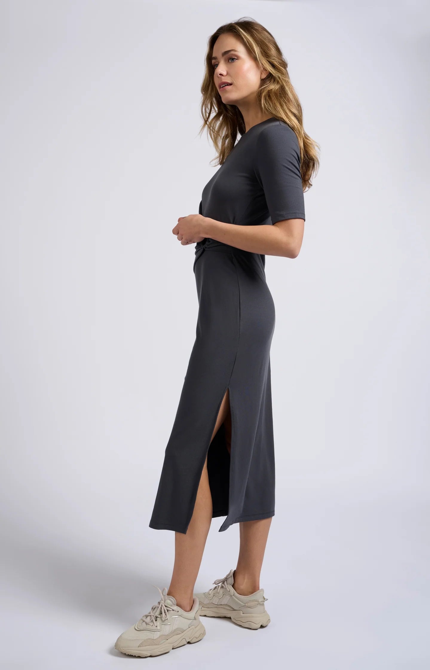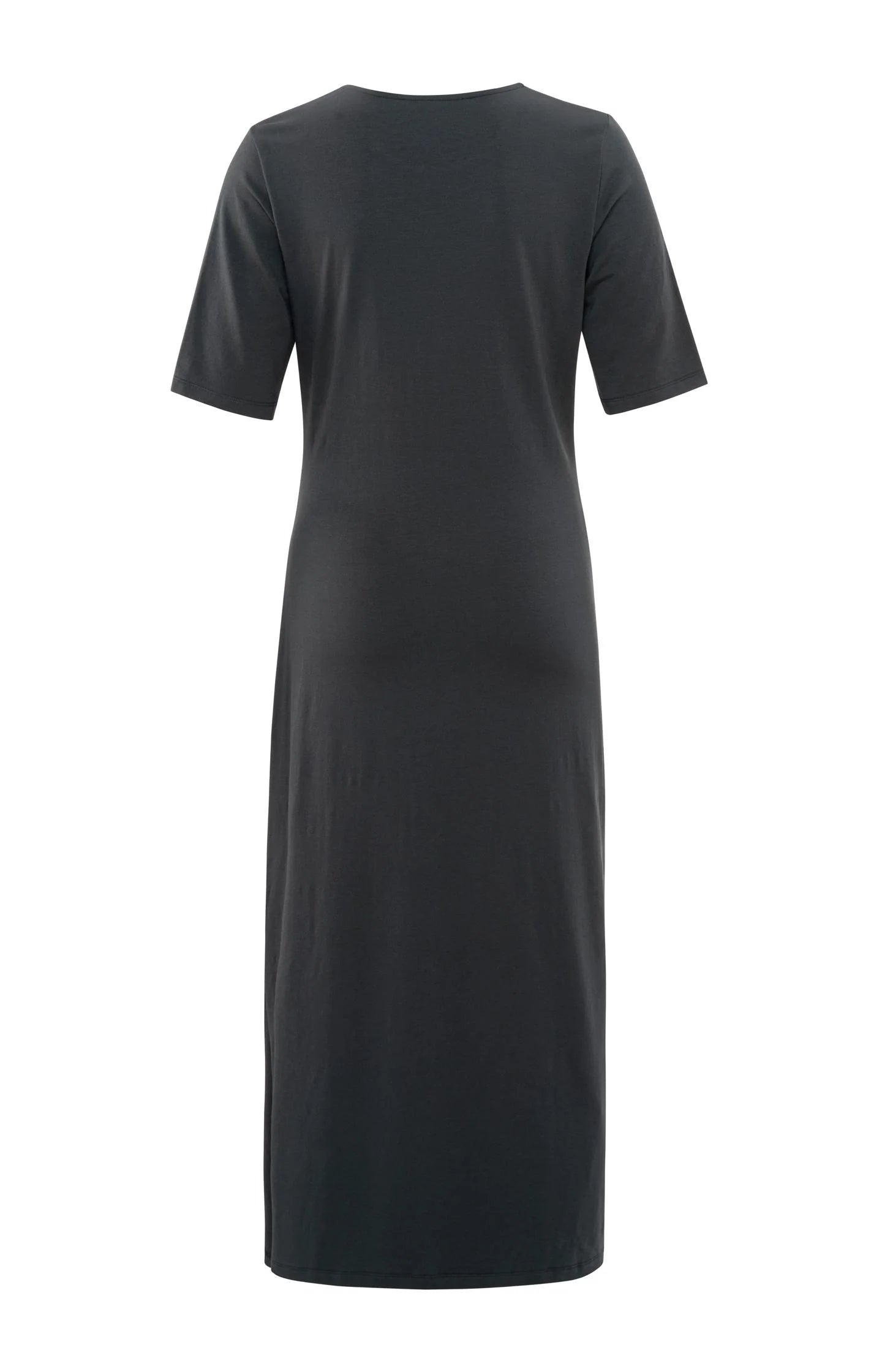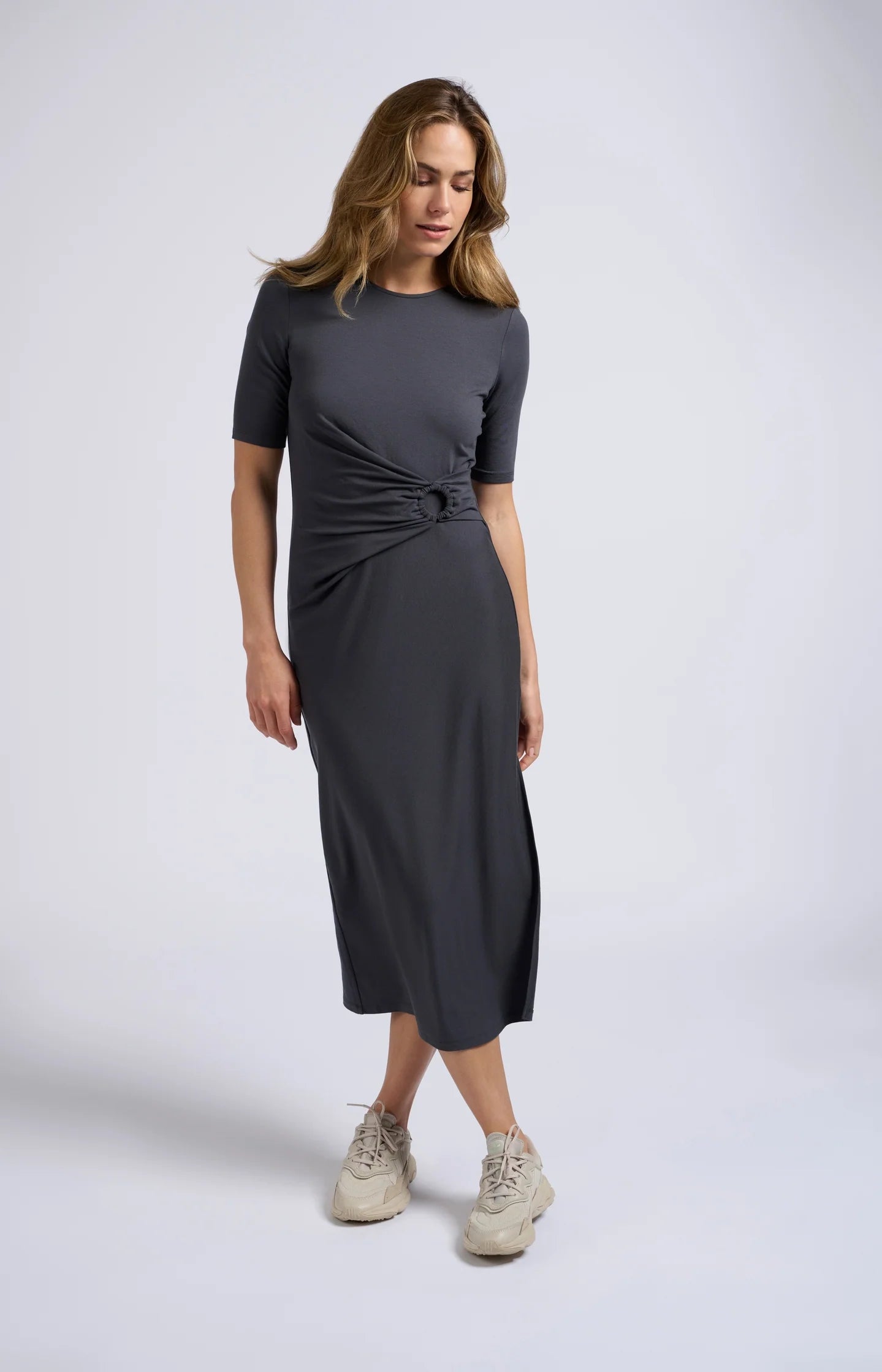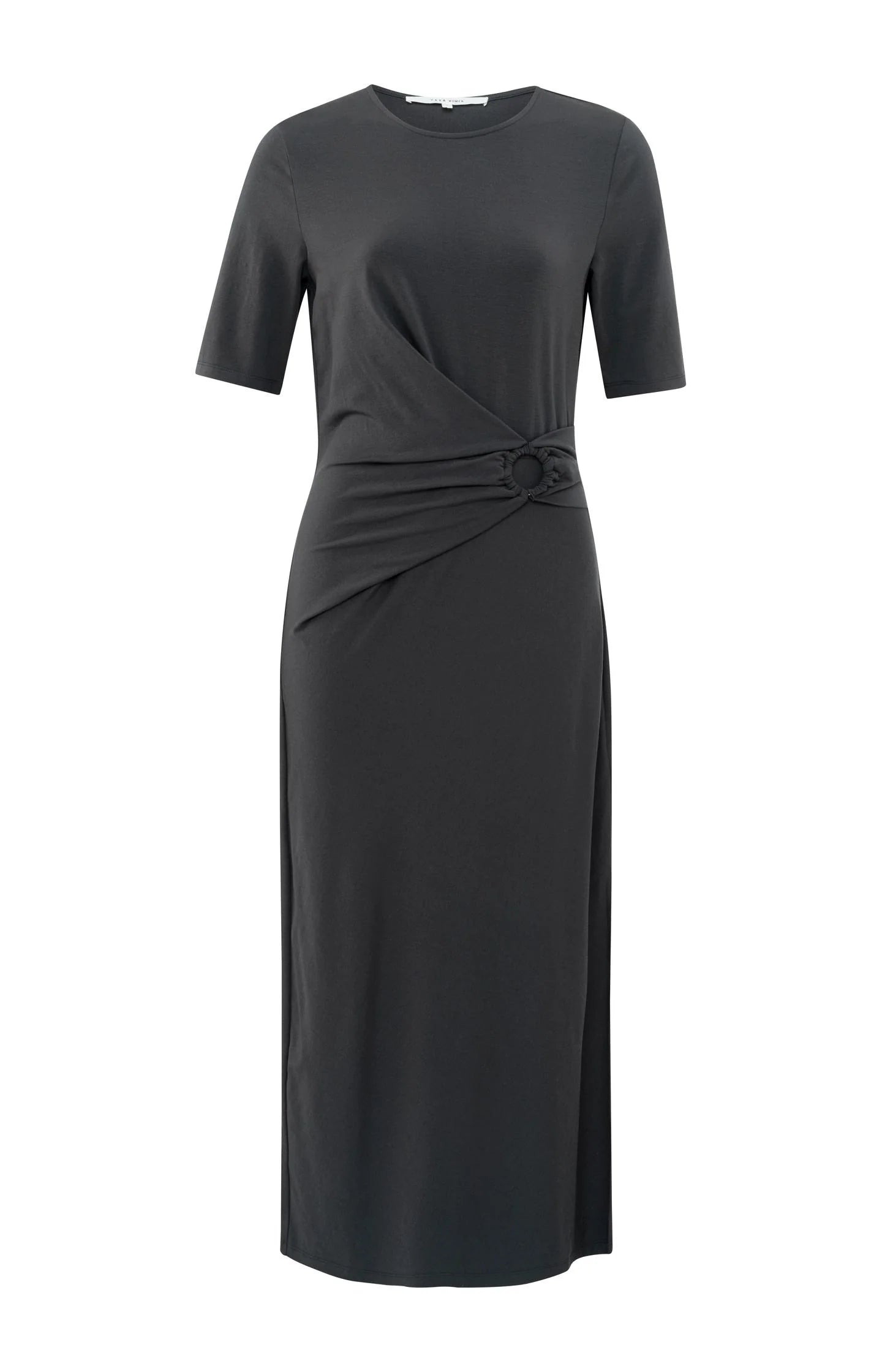 This Anthracite Short-sleeve Midi Dress by YAYA exudes both style and comfort. With a round neck, short sleeves, and a pleated ring detail, this dress is perfect for any occasion. The soft fabric adds a touch of luxury while the model-inspired style brings a sense of sophistication. Available in various sizes.