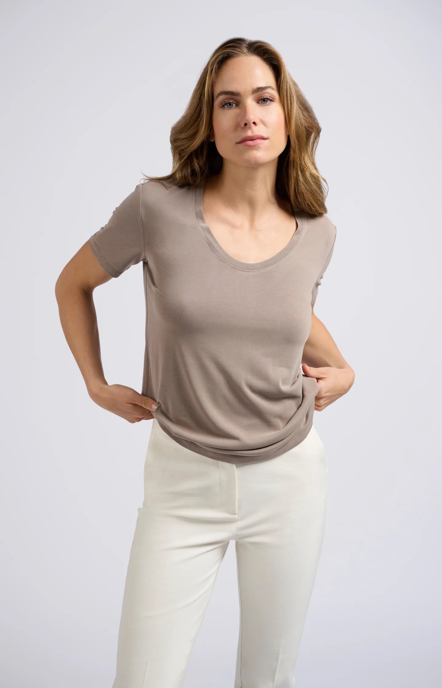 Elevate your wardrobe with the YAYA Round V-neck T-shirt in Clay Pebble Grey! Made from a soft and comfortable modal blend, this T-shirt features a flattering round V-neck and short sleeves for a classic look. With its regular fit, it's perfect for any occasion. Available in size S to fit your style.